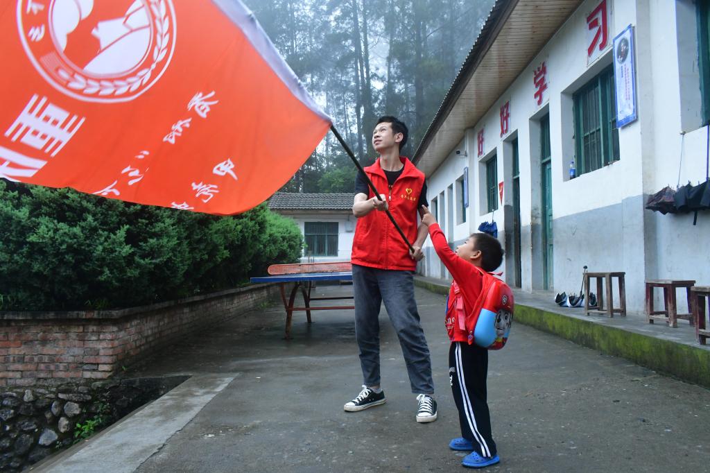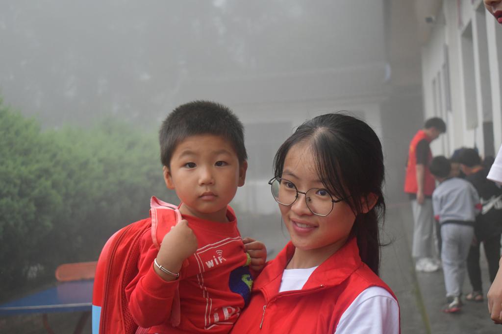 手把手指导,心连心交谈。轻快的脚尖一掂一掂的落在台阶上,大大小小几十个孩子一股脑冲到操场有序站立在一方。“我来自偶然 像一颗尘土,有谁看出我的脆弱………”歌声响起,志愿者们带领着小朋友学习手语舞—《感恩的心》,单手举起又落下、绕圈再落下、手指轻抚过空气……看似简单的动作在孩子中却略显笨拙,初学的几个男孩些许扭捏,但在众多志愿者热切鼓励和带动下继续努力学习,逐渐摆脱尴尬,释放舞者的灵魂。男孩女孩交织错落,志愿者在两旁陪伴,舞姿渐渐整齐流畅,成就感在孩子和领舞者的脸上蔓延绽放出一朵朵娇艳的花朵,开满整座山峰。雨势渐大,淅淅沥沥,雾气氤氲缭绕模糊掉了他们的笑脸,但难以掩盖“呵呵呵呵”的笑声。