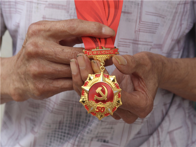 习总书记说:“新时代是需要英雄并一定能产生英雄的时代。”一百年征程波澜壮阔,五十载初心历久弥坚,磨盘石文化艺术服务团在村支书的带领下,来到鞍子苗寨一位老党员家中,任爷爷把五十年党龄纪念章紧紧捧在手中,忆往昔峥嵘岁月,任爷爷激动地表示:“一切为了人民,服务人民,吃苦要在人民前面,享福要在人民后面。”在交谈中,党员爷爷多次嘱托志愿者们,要不忘初心,永远跟党走。一枚小小的纪念章彰显了党中央对老党员同志的肯定和褒奖,也凝聚着党和人民对革命先辈们的感激之情。志愿者们被任爷爷的滚烫初心所感染,将一首《没有共产党就没有新中国》献给任爷爷,献给党,作为青年学子,都应该常怀忧党之心、为党之责、强党之志,以恒心守初心,学习老党员身上的高尚情怀、奋斗品质、敬业态度和斗争精神。