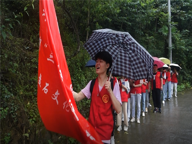 密密的雨幕中,鞍子镇大街上热闹非凡,此起彼伏的叫卖声、不绝于耳。鞍子苗寨的集市朴实无华,大部分商品都是特色手工食品,其中一道斑鸠豆腐引起志愿者们的好奇,卖豆腐的摊主奶奶热情讲解下,志愿者们了解到斑鸠叶豆腐需要用新鲜的斑鸠叶制作,是天然绿色的健康食品,也是自古以来苗寨人勤劳与智慧的结晶。突然间都滂沱大雨,阻挡了许多寨民赶集的步伐,商贩们纷纷开始收拾着货物,志愿者们迅速加入到收摊的队伍中,红马甲忙碌的身影在雨中便是一道亮丽的风景线。