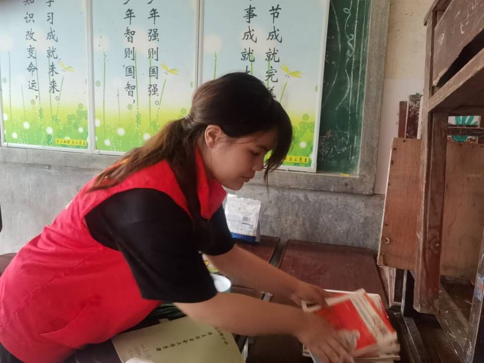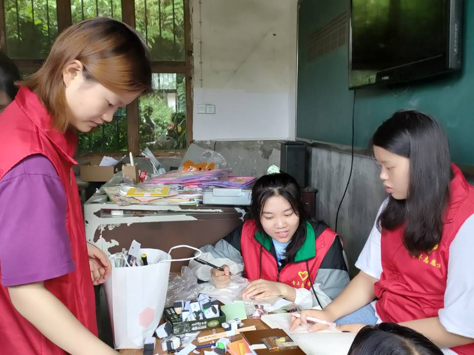 时光兜兜转转,就到了分别之时。可惜天不作美,暴雨依旧,甲壳虫们被迫取消今日的表彰大会。为孩子们留下的什么吧!行动起来,一张凳子,一台相机记录下甲壳虫们发自己内心的话:“看你欢笑,陪你成长,你们的一举一动的深深的打动着我,哥哥姐姐就此离去,你们要开开心心哦。”单单的话语未免太过干瘪,来一场表演吧!嘹亮的声音响起:“志愿服务源于心,奉献爱心始于行。我们都是志愿者,我们有共同的志愿:奉献、友爱、互助、进步。爱在心中,路在脚下。”微不足道的礼物,是甲壳虫们最美的心意。甲壳虫们拆开带来的物资,在书包、橡皮擦,文具盒、信封纸等物资上贴上孩子的名字,统一将礼物和视频打包,转交给村小负责人胡老师。