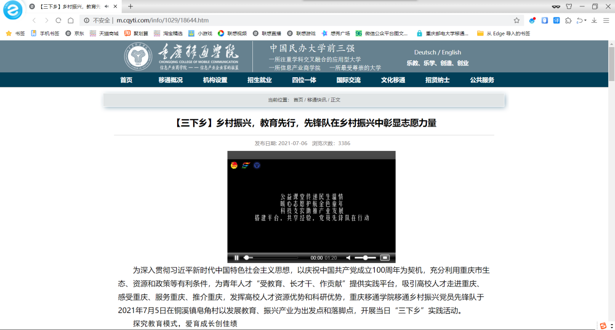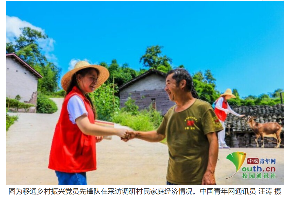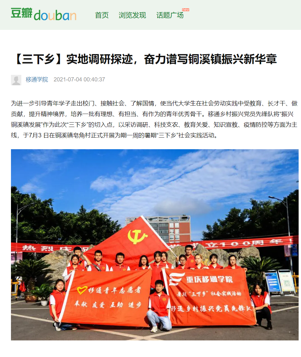 移通乡村振兴党员先锋队不仅在实践活动上丰富内容、创新形式,并注重扩大活动影响力,日均产出一部点赞量高达1000余次的视频和浏览量高达3000以上的新闻稿。不仅如此,志愿者历时8天倾心打造出《镜头中的铜溪镇》宣传片,全方位向外界展示队伍的七日实践成效。除此之外,队伍还借助校内校外新媒体平台同时为振兴铜溪镇乡村发展发声,依托校内官网、校外中青校园网、重庆晨报、大学生网报、豆瓣网、搜狐自媒体等10余个大型媒体宣传报道,总浏览量高达60000余次,为队伍在铜溪镇开展的暑期“三下乡”社会实践活动广大宣传,让社会广泛关注铜溪镇地区的经济、教育等方面。凝聚更多的力量,汇聚成一片光明,为乡村点亮未来之路。