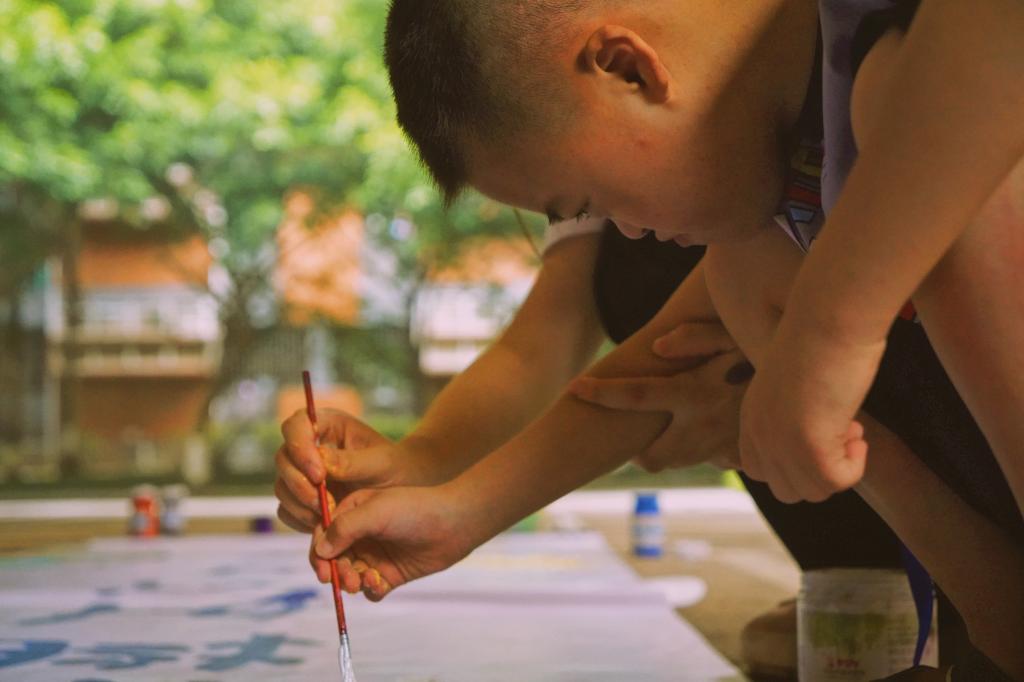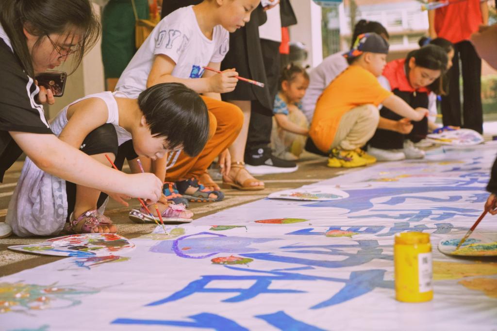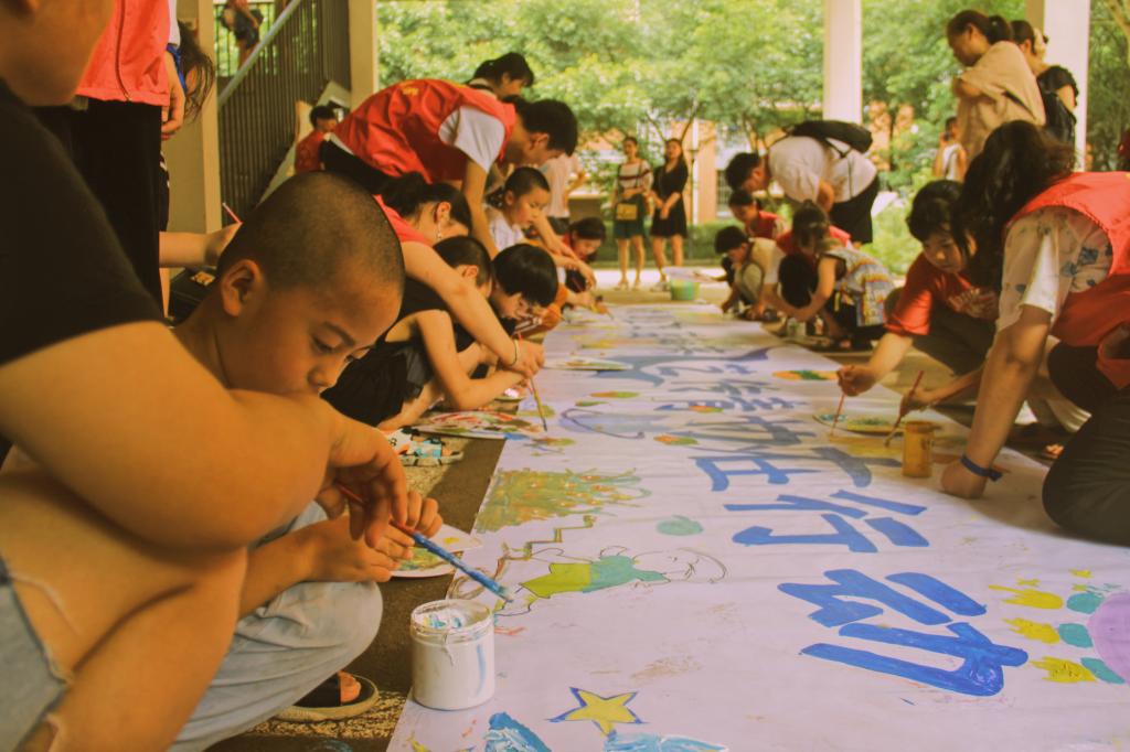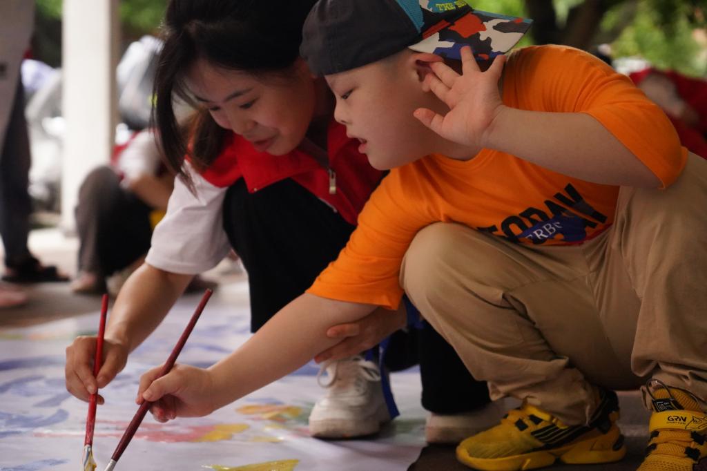 夏日的雨后气温有些闷热,但丝毫不能阻挡“星星的孩子”欢洽的脚步。在“卫星”志愿者的带领下,家长和小孩来到重庆移通学院别读书院四维空间楼下,志愿者们大手握小手,细心引导小朋友进行十米画卷的颜色填充,他们挥舞着笔尖留下一幅幅奇幻的图案,这或许就是来自自闭症儿童内心深处的畅想,即使他们封闭自己的双唇不与外界交流,可思维却格外活跃,每一个孩子都是“奇思妙想”的小能手。