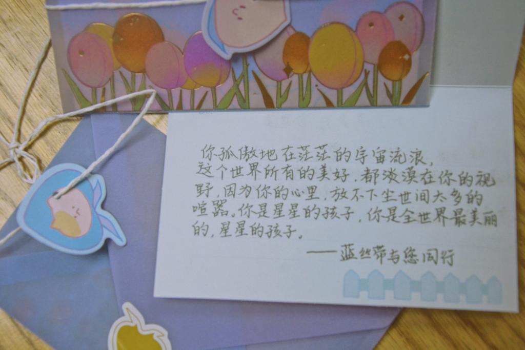 奉献,是一件很美妙的事情,三下乡的日子里,我深深的体会到了集体活动调研的辛苦,看见大家都用心想为"星星的孩子"努力做点什么,以此为目标而团结努力,便能更感受到这一份夏天的炙热。走过无数条街道,曾一起为大众解释关于自闭症去了解他们的关心、在人潮涌动的商场里身穿玩偶服拥抱每一个善意的人、也在休息的片刻一次次排练期望能带给小朋友精彩的表演,在看见孩子们的那一刻吹散一切疲惫,他们天真无邪、专注认真的表情带给我们无限的赞美与美好。未来也将会继续努力将蓝丝带的温暖带给更多人快乐,新的故事会在未来的奉献中带去更绚丽的颜色。