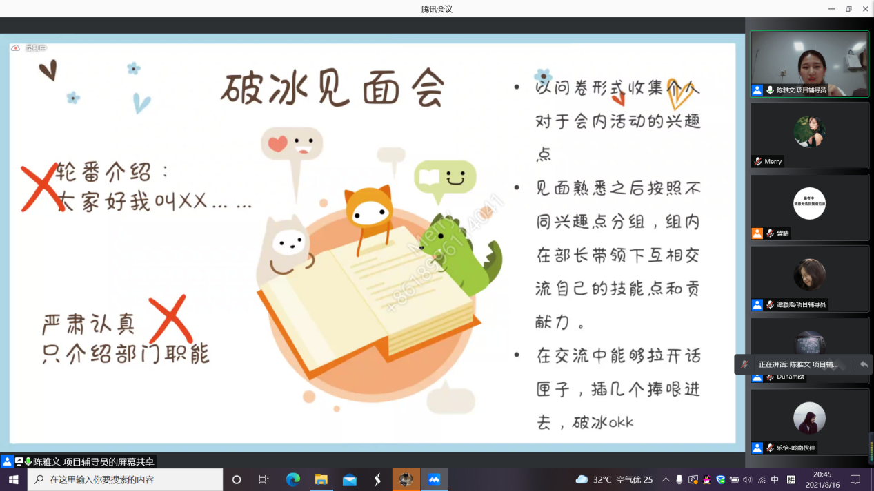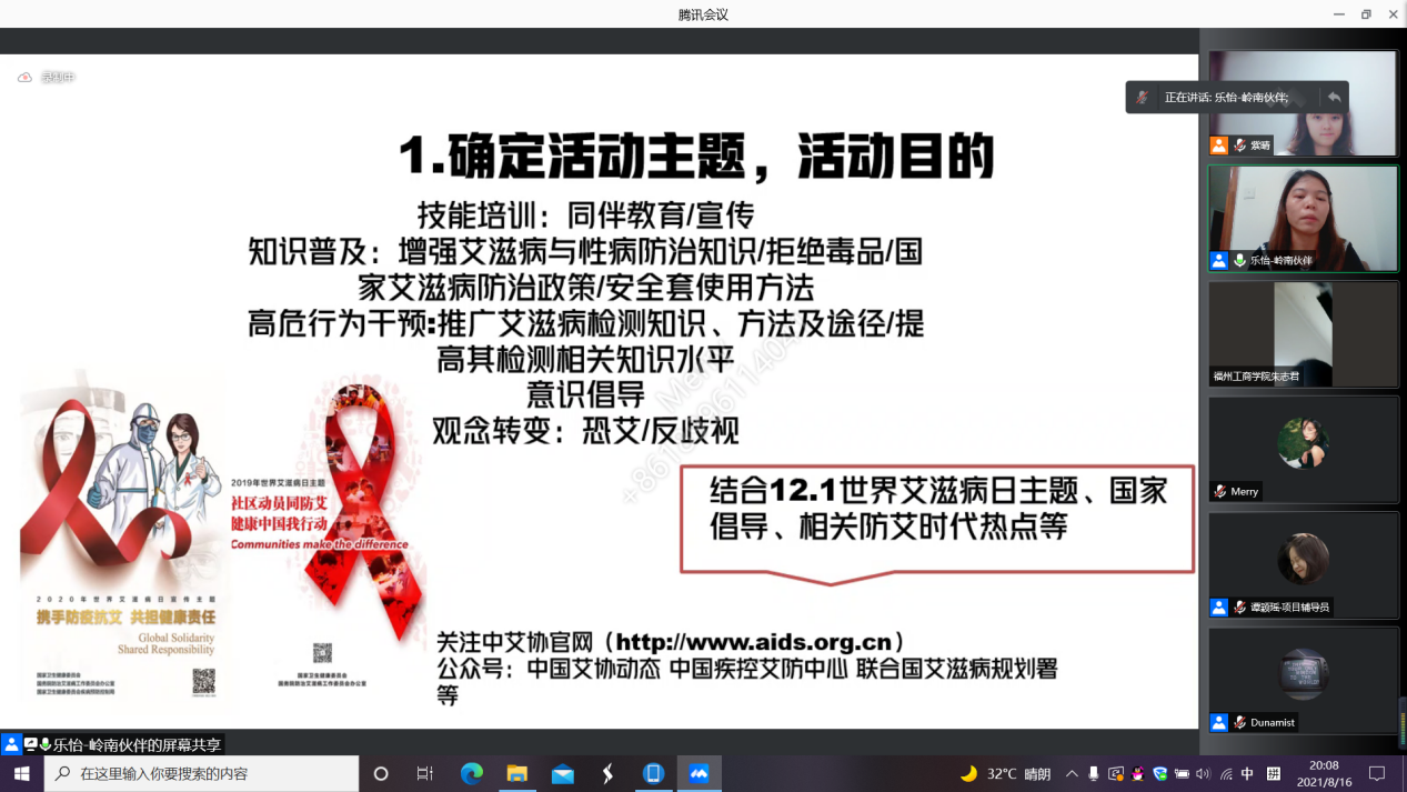 跟随中国青年志愿者协会步伐,坚定踏好未来移通志愿之路。2021年8月16日19:30-21:00,由高校防艾基金办组织开展的高校防艾基金办项目管理线上交流会顺利召开。旨在了解团组织对中艾2021年高校防艾基金项目的解读,着眼于项目执行,同时学习社团的培育技巧、痕迹材料整理、活动宣传和创新等。