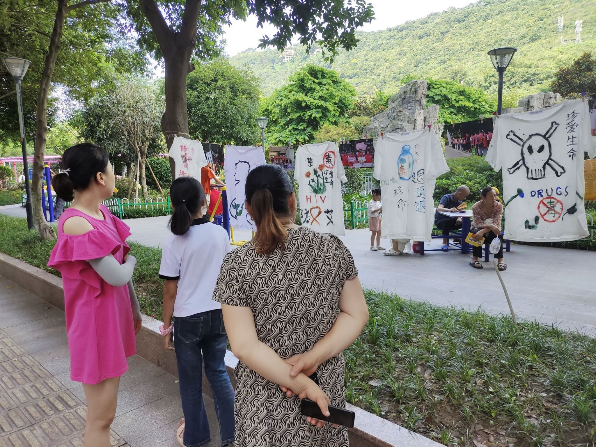 7月9日清晨,禁毒防艾宣传团在綦江区沙溪公园开展了一场文化衫展览活动,它不仅是本次三下乡活动的总结,更是沙溪社区小朋友们爱心与才华的璀璨绽放。