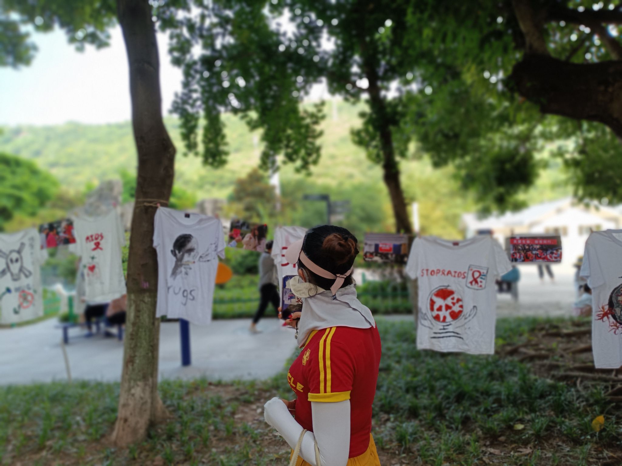 展览现场,色彩斑斓的文化衫吸引着过往行人的目光。小朋友们以稚嫩却充满力量的笔触,在衣物上勾勒出一幅幅生动的画面,从“防艾不防爱”的温情呼吁到禁毒主题的深刻警示,每一幅作品都是他们对世界美好愿景的纯真表达。这些画作虽无繁复技巧,却饱含着孩子们对生命的敬畏、对社会的责任感以及对弱势群体的深切关怀,它们如同夏日微风,轻轻吹散了社会对艾滋病患者的误解与隔阂,让爱与包容的阳光普照每一个角落。