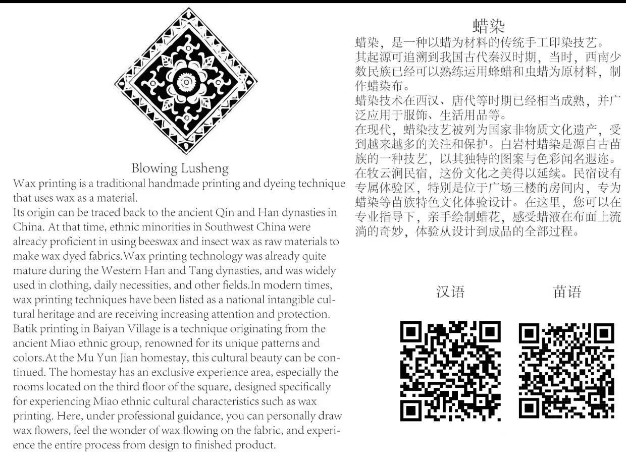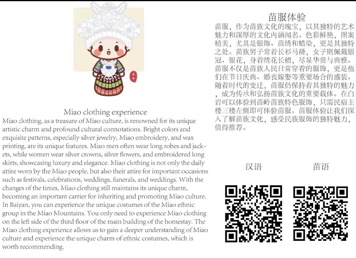 紧接着,志愿者们将“苗普”双语二维码与白岩村特色活动的汉语简介相融合,并配备英语翻译,制作出了“苗普”双语导览标识牌,确保每一位游客都能够畅游白岩村。这些导览牌将被安置在村内的各个角落。此外,志愿者们还怀揣着更远大的愿景,他们希望这些简单的二维码,能够成为苗乡文化的一张张数字名片,跨越地域的限制,将白岩村的故事与风情传播至更广阔的天地,吸引四面八方的游客前来探访,亲身体验白岩村的文化底蕴。