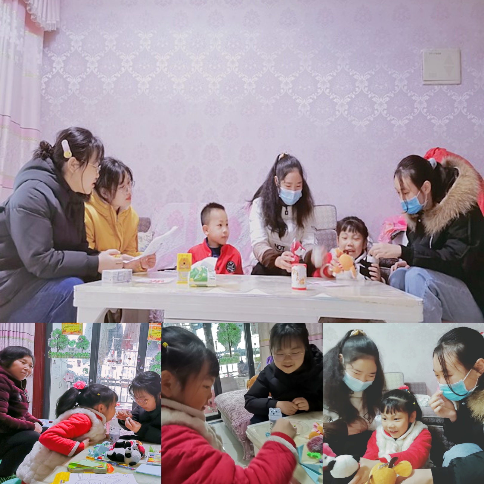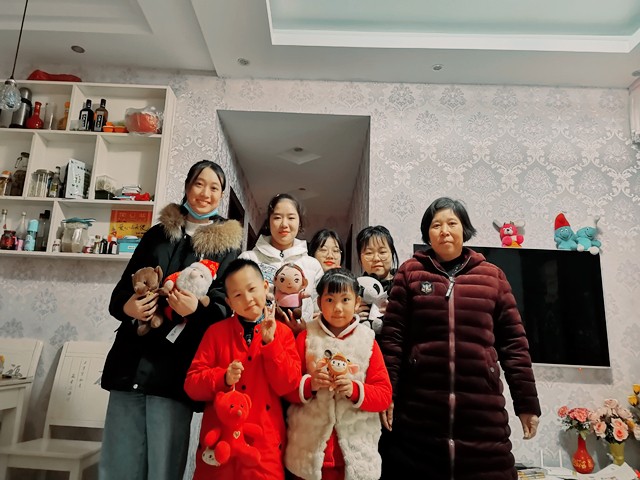 后面小歆艺又从房间中拿出折纸和娃娃。小歆艺的娃娃很多,龙婆婆在旁边说“这些娃娃,很多都是你们志愿者带来的!”娃娃虽小,但却可以给一个小朋友带来快乐,让她在无聊的时候,可以跟娃娃一起玩耍。小歆艺和志愿者们一起把娃娃在桌子上摆放整齐,然后玩起了游戏。时间过得很快,到了要说再见的时候,小歆艺、龙婆婆和志愿者们拿着娃娃在一起拍了合照,小歆艺很舍不得志愿者们,和婆婆一起送志愿者们到楼下,挥手告别,并约好下次见。