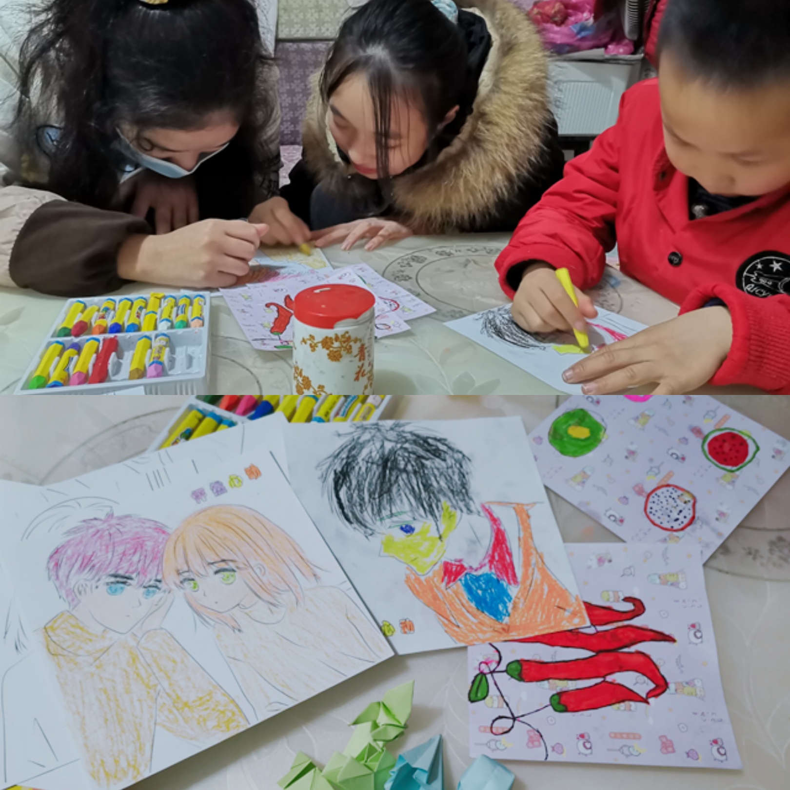 到小歆艺家中,家里被整理得干干净净,进入歆艺的房间,首先映入志愿者眼帘的就是桌子上摆放着小歆艺刚刚画好的画,很好看。龙婆婆在旁边说“这个孩子画画可好了。”志愿者们都不禁向小歆艺竖起了大拇指。歆艺笑了笑,从她的桌子里拿出彩色的纸和蜡笔,小歆艺将志愿者们和她的小伙伴分为了三支队伍,两人一组,然后小歆艺给每支队伍给了一张彩色卡纸,当志愿者们看着落单的小歆艺,问到“那你画不画啊”,小歆艺摇了摇头,“我今天是评委,来监督你们哦。”志愿者们开心的笑了,开始认真的上色………
