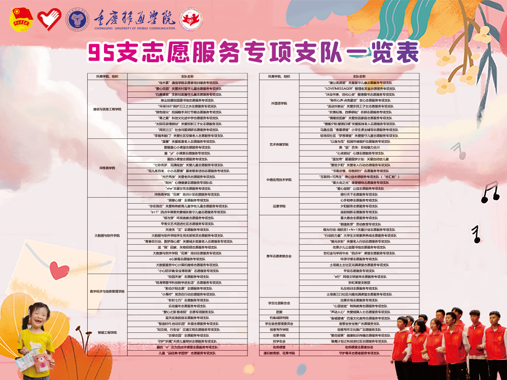 志愿服务专项支队做为我校志愿服务的板块的重要抓手,给移通学子提供了学习体验的平台,为了促进我校志愿服务健康有效长期的发展,形成高效有序的运行机制,我校在2015年开始成立志愿服务专项支队。2015年至今先后共志愿服务专项支队95支,他们用实际行动传递着奉献、友爱、互助、进步的志愿服务精神。为进一步扩充学校志愿服务力量,提升志愿服务影响力,9 月23日—24日志愿服务专项支队面向全校在黄桷树广场进行招新工作。此次招新共计2300余名同学参与线下体验,他们的到来定能成为各个志愿服务专项支队有力的“后备军”!