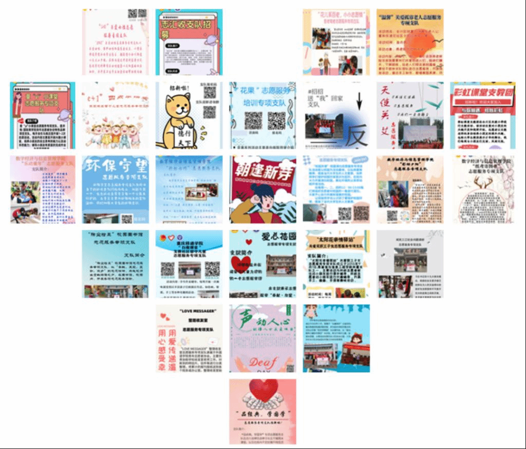 今年的支队招新也是在大家的翘首以盼中拉开帷幕。各学院、组织为了此次招新下足了功夫,做足了准备,多平台进行宣传,向大家介绍了各支队的活动和意义,让有志加入志愿者行列的学生借助支队这个的平台塑造自我,增加为社会服务的志愿能力。近百个支队为秋日校园增添了无限姿彩,在招新过程中尽显支队的优势和特色。环保守望志愿服务专项支队进行环保知识宣讲、花果少儿公益图书馆为小朋友搭建课外兴趣课堂、橙光行动-消防员1+N+1关爱计划给合川消防员带去关怀……