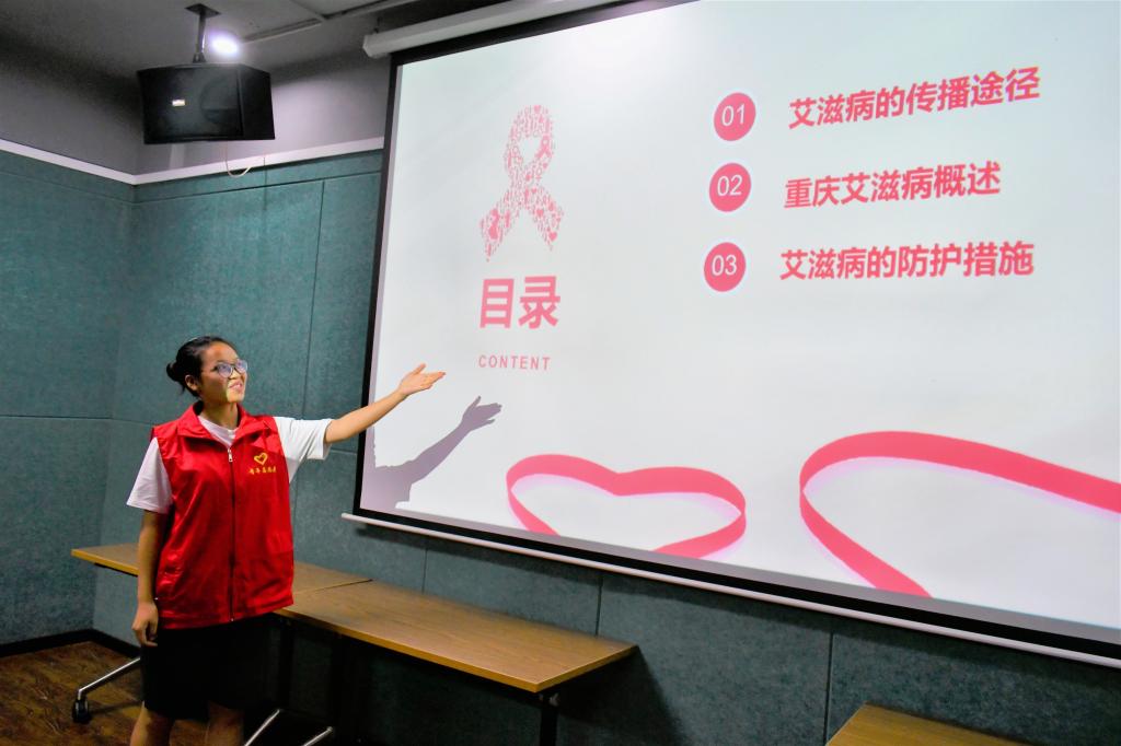 根据世界卫生组织统计,目前中国艾滋病感染人数在亚洲位居第二位,重庆艾滋病案例高达31092例,异性占比78%,男同性占比19.5%,其余2.5%。观影会上,天使关“艾”志愿服务专项支队的志愿者饶雪梅来到现场进行防艾宣讲,饶雪梅同学提问到:“为什么川渝地区艾滋病病例如此之多”。教室瞬间变得热闹起来,同学们积极的相互探讨并得出川渝地区人口基数大,人际交往相比其他城市复杂的观点。