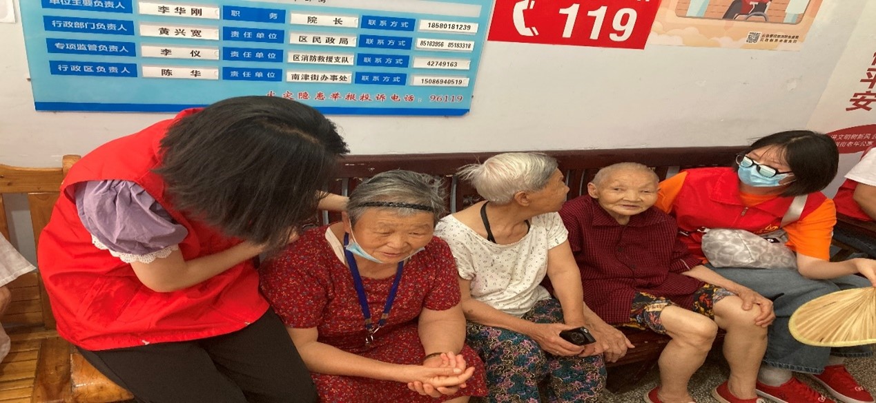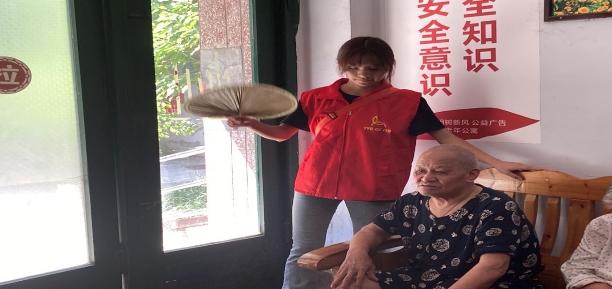 在与老人自由畅谈的同时也认真倾听老人们讲述着合川的悠久历史,在农历五月初五这天赛龙舟、抓水鸭,可谓是一片热闹。老人望着门外,没有焦距的目光似乎在回忆着什么。虽已秋分,天气仍是火热,开着空调的屋子也因盛满了一颗颗炙热的心开始闷起来,志愿者们拿着院里的蒲扇,为老人轻轻的扇着风,老人也哼起了一首年代久远的红歌,时间就这样一点点的流逝。