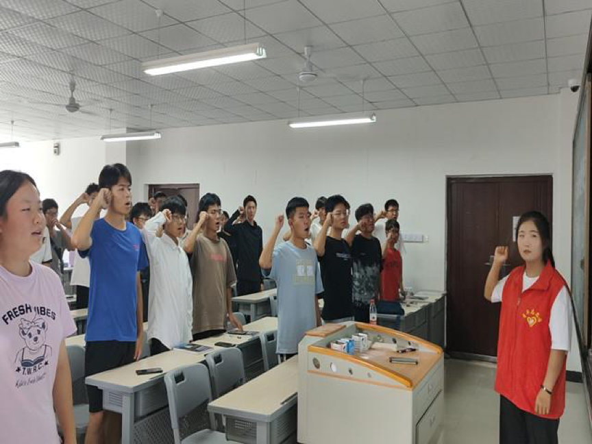 全体起立!同学们将右臂从身体右侧举起,手部握拳与耳等高,目光注视着屏幕。在这庄严肃穆的时候,“我宣誓!我愿意成为一名光荣的志愿者……”伴随着一句句誓言的结束,同学们眼睛里的目光更加坚定,心中更加自豪。