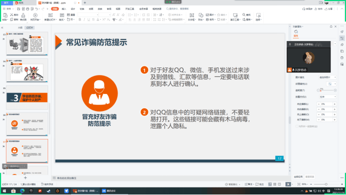 志愿者通过线上PPT演讲的形式从什么是电信诈骗、电信诈骗的常见形式、如何识别防范电信诈骗进行深入详细的讲解,让同学们充分了解什么是网络诈骗,理解提高自我防范意识的重要性,主持人向同学们讲述了许多有关网络诈骗的案列,如淘宝诈骗诈骗,切实增强了同学们在生活中遇到诈骗时灵活应对的防范意识,提高了他们各方面自我预防、自我保护、自我应对能力。