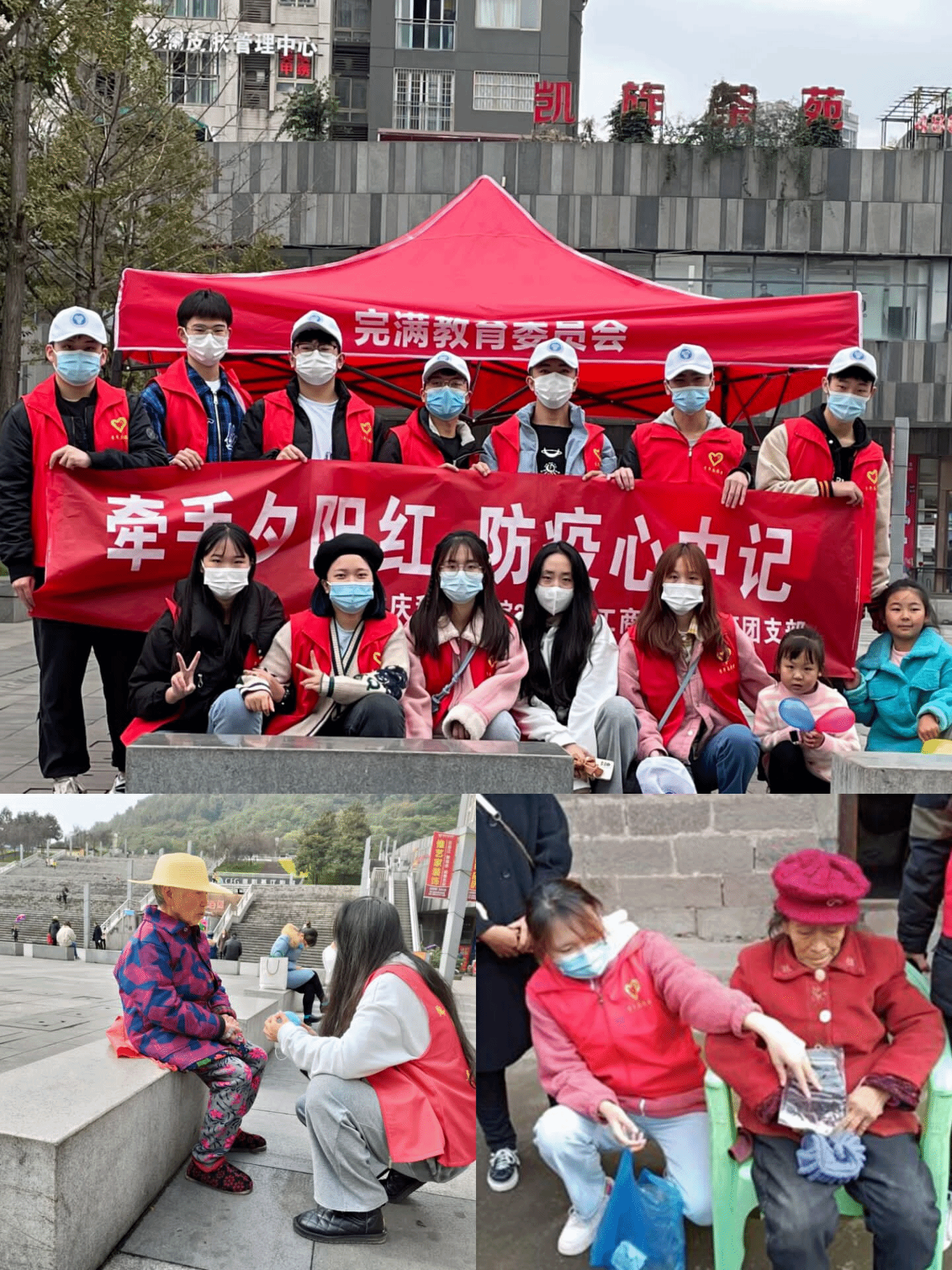 工商管理类15班和25班班团支队为老人们送去了爱心和温暖。15班班团支队以“公益在线·爱心无限”为主题,来到学校对面的三桥村,为孤寡老人送上手套棉帽,唠嗑家常,让他们感受到冬日里的一份“移通温暖”。25班的同学在綦江盘山广场一边为老人发放爱心口罩,一边做防疫知识宣传,充分展现了我校积极配合疫情防控工作和志愿者关爱老人的温暖情怀。15班和25班每一位同学的力量齐聚一“綦”,展现了商院学子主动奉献的精神风貌。