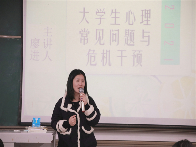 活动伊始,主讲师廖进老师就开门见山的介绍了心理问题在同学们日常生活中的重要性,以及现在大学生常见的一些引发心理问题的因素,例如:学业压力,就业压力,人际交往等等,在这些因素的作用下,如果没有及时使用正确的方式来疏导和排解,让焦躁不安的情绪挤压在心里,长此以往,就可能造成一些精神疾病,使人长期的在精神和肉体的双重折磨下面临奔溃。在大学的不同阶段中,每个人都有在面临着不同的问题,在这些问题发生后,大家更应该以积极、乐观的态度来面对。