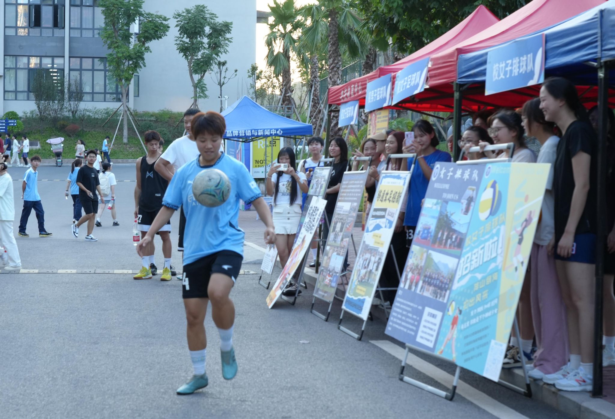招新现场,各运动项目的教练和队员们热情洋溢地向前来咨询的学生介绍各自队伍的项目特点、团队文化、训练日常等。通过现场讲解和展示让学生更直观地了解,足球、篮球、排球的赛场英姿,啦啦操、武术的灵动演绎,亦或是户外探索、水中遨游的独特魅力。展示了校运动队在过往比赛中取得的优异成绩,分享了自己在训练中的心得体会,激发了学生们对体育运动的热情和向往。