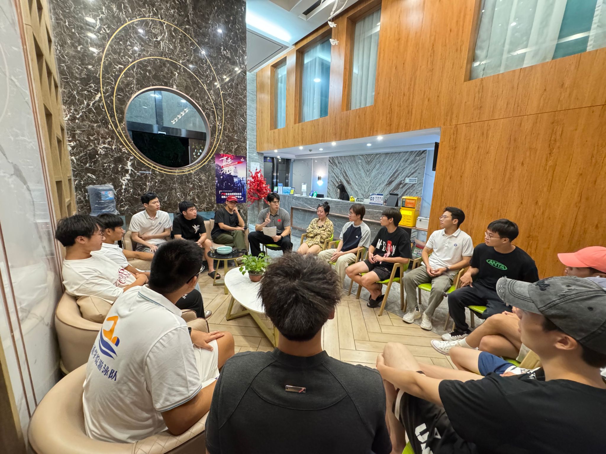 本次比赛出征的队员大多为首次参加公开水域项目,与日常训练的环境有着很大差异。由于户外游泳,能见度降低,非常容易丢失方向。初次参加比赛的队员们对此感受到了很大的心理压力,并且竞赛距离长达1500M,体力上一种考验。为了队员们能够减少心理压力,克服恐惧、战胜自我、挑战极限,在到达赛场的晚上,教练员给队员们进行可以此赛前心理辅导,一个竞赛过程中需要注意的事项、突发情况的处理方式,以及可采取的个人战略。