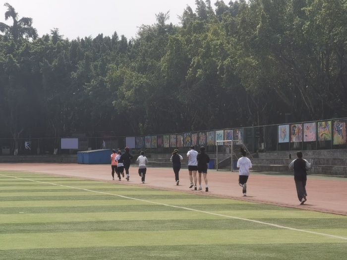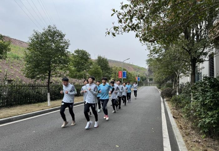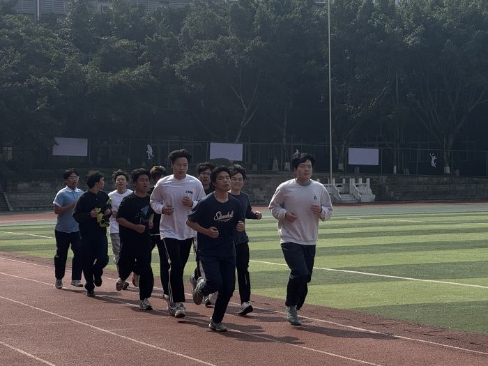 随着新学期的到来,我校铁人三项队迅速进入了紧张而有序的训练状态。校男子铁人三项队在李游、黄静两位教练的带领下正有序推进有规划的恢复性训练,旨在助力队员们尽快恢复至最佳状态。主要以有氧跑+身体素质训练为主,有氧跑步训练时长为 40 分钟,部分队员因尚未完全适应训练强度,跑步时身体姿态出现偏差,但在教练的精准指导下,逐步得以纠正。在跑步训练中,当有队员体力不支时,队友们相互鼓励、携手共进,确保无人掉队。
