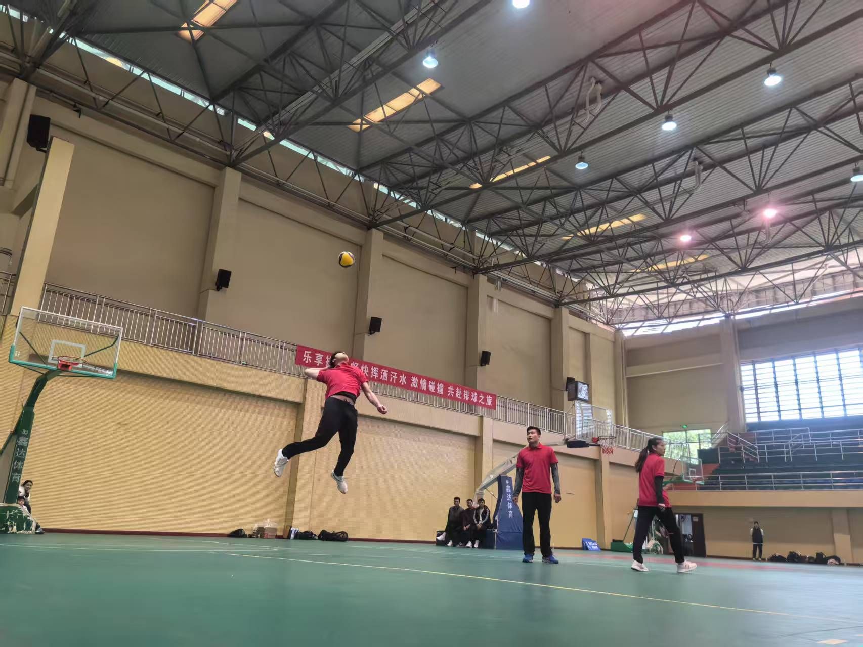 赛场上,各高校参赛队似脱缰骏马,尽显超凡实力与拼搏精神。重庆移通学院由合川、綦江校区联合组建的教职工队,更是训练有素,表现夺目。发球时,他们手臂有力,排球如炮弹般飞向对方;接球时,队员眼疾手快、灵活走位,稳稳垫球;传球时,彼此心有灵犀,路线精准;扣球时,高高跃起如雄鹰展翅,凌厉扣杀令对手防不胜防。每个动作流畅自然、一气呵成,尽显扎实基本功与精湛球技。
