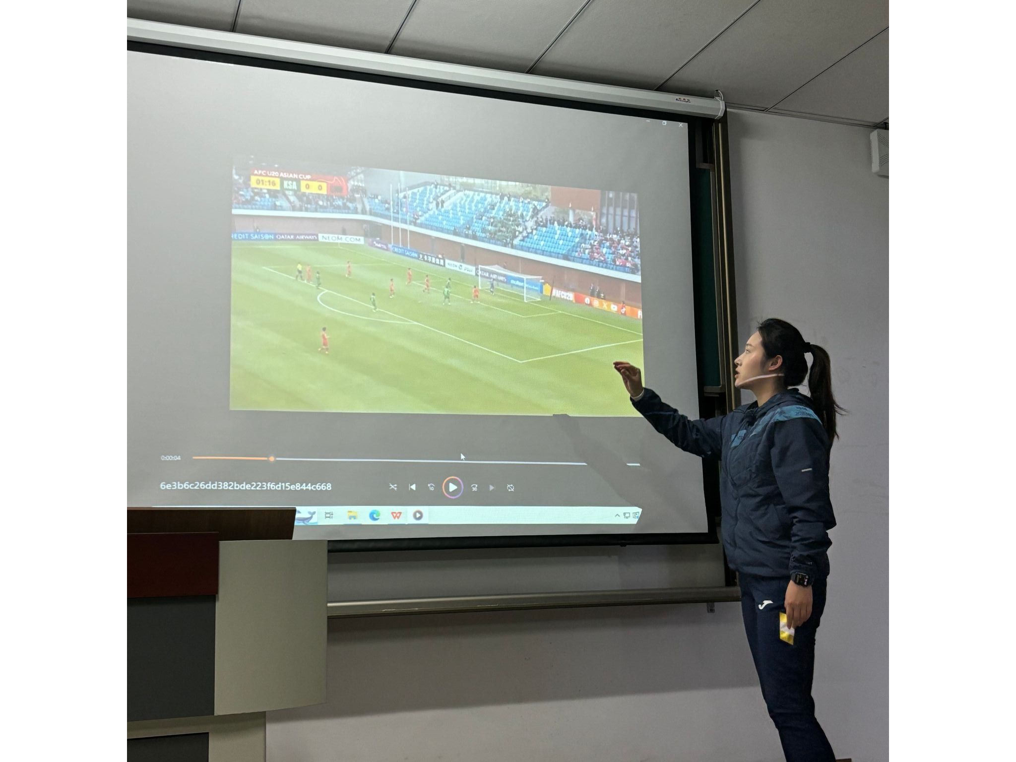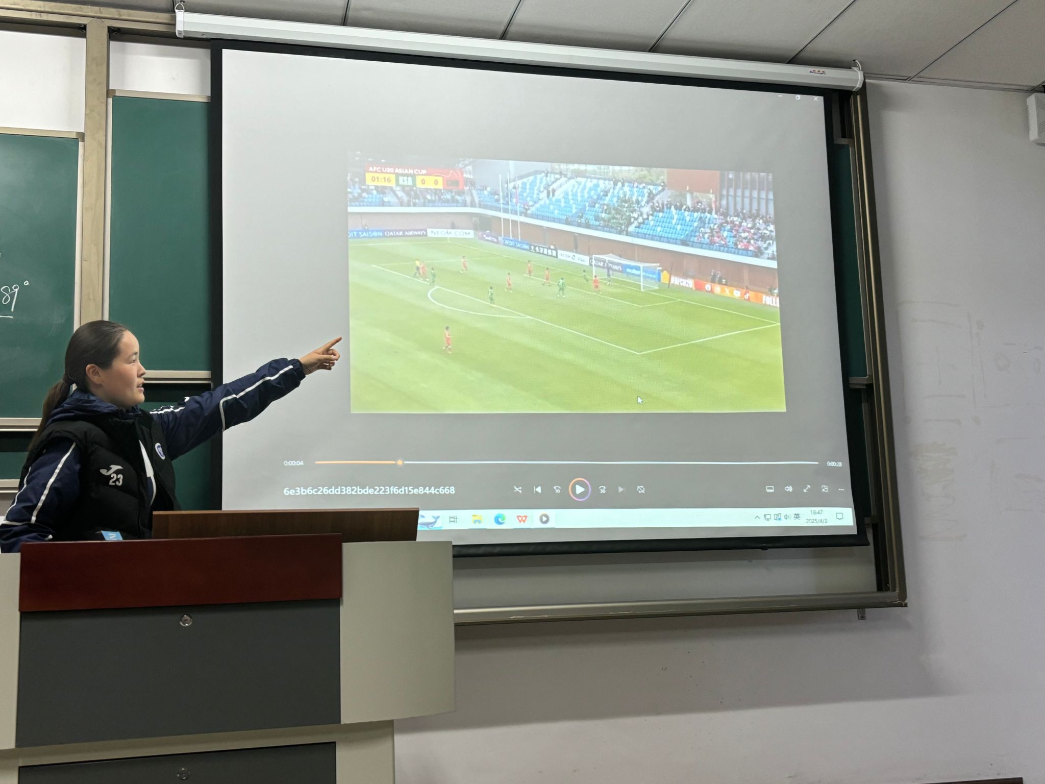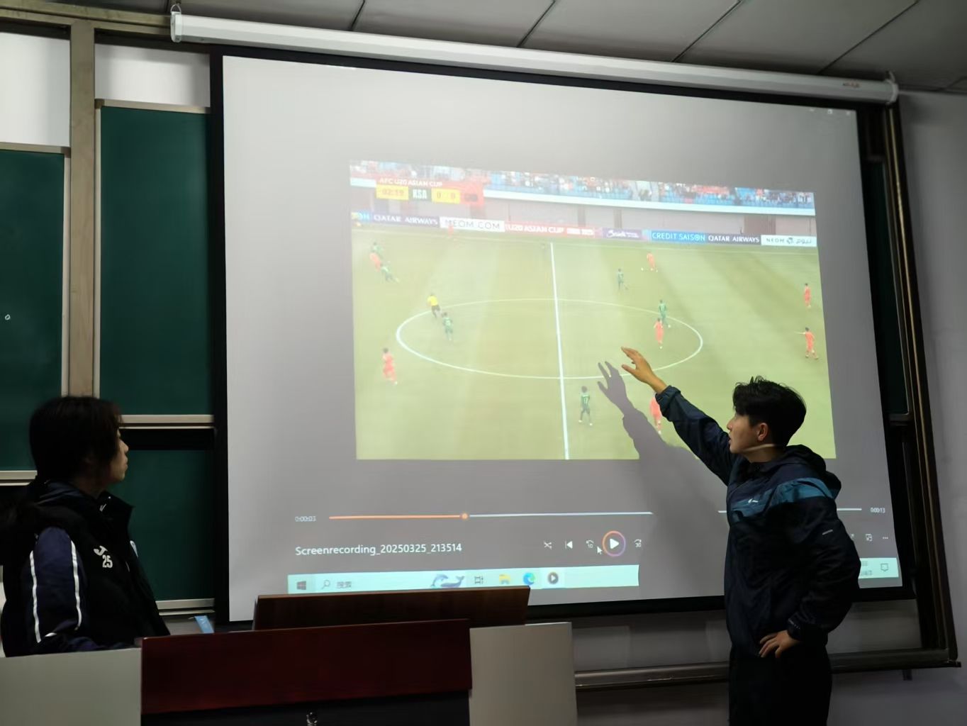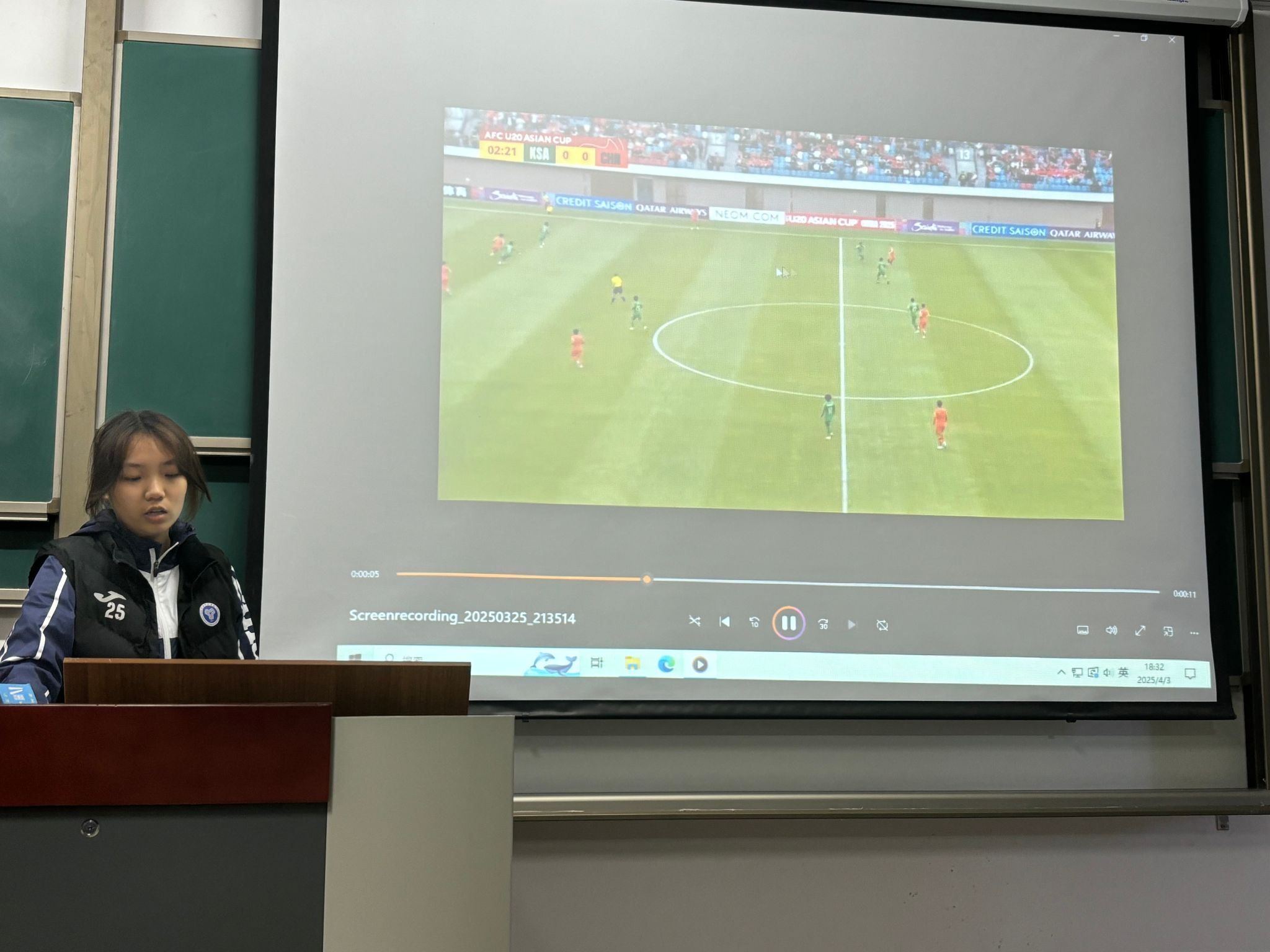 2025年4月14日重庆移通学院女足运动队在天空书院308教室组织了一场关于U20国青vs沙特世预赛的视频分析训练课。此次理论学习课队员们结合自身训练和比赛中会出现的问题,通过剪辑比赛视频片段,每位队员都上台来分享自己的思考和见解。