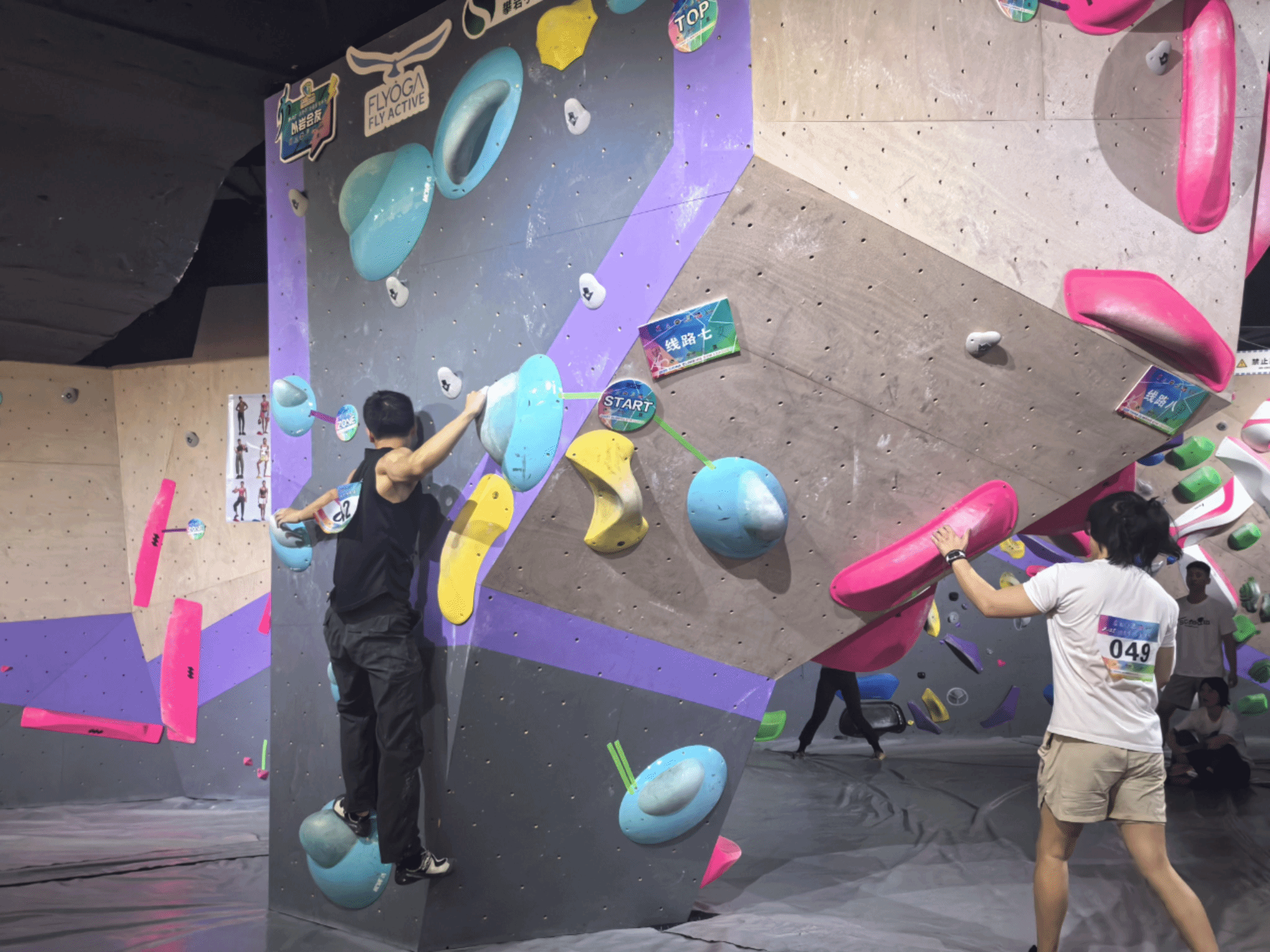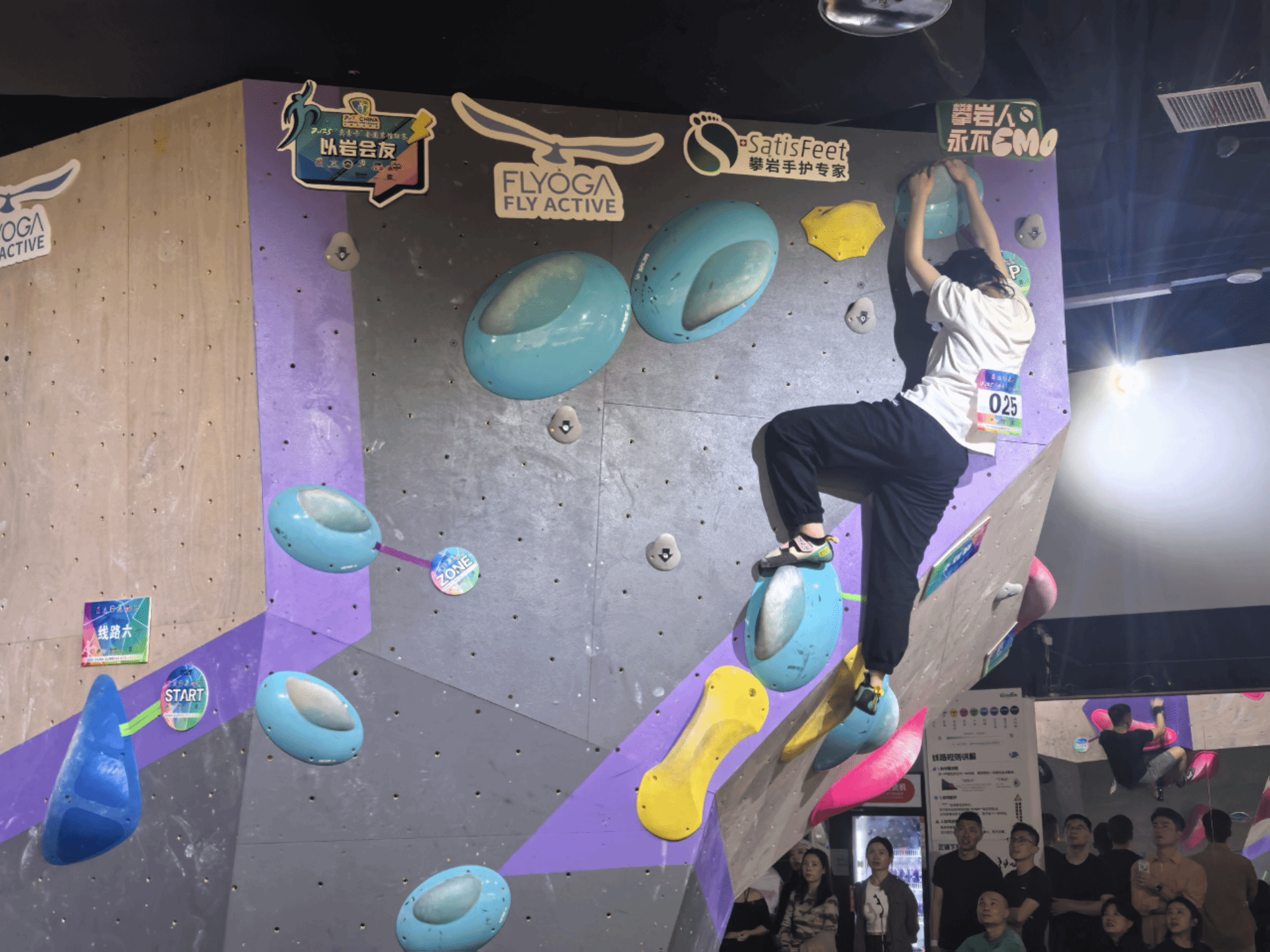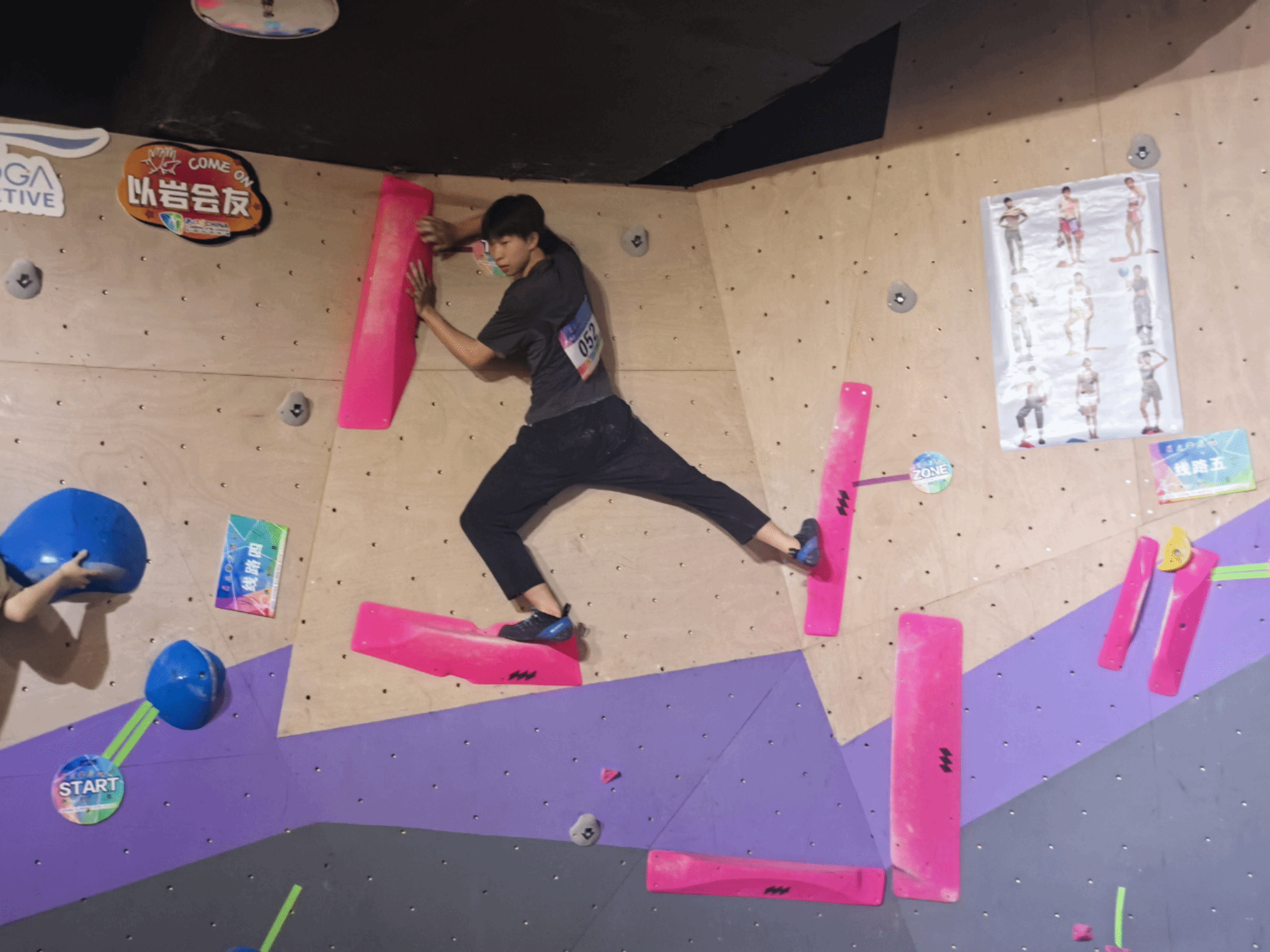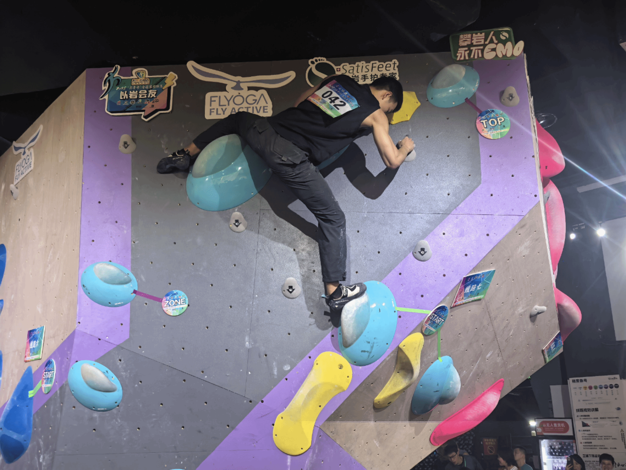 比赛中,郑星宇面对多条技术型抱石线路,展现出超乎新人的沉稳与专业。在最具挑战性的挑战赛线路上,他通过精准的脚法和稳定的核心控制,连续完成多个高难度动作,其干净利落的攀爬风格和沉着冷静的临场表现,赢得现场观众阵阵掌声。