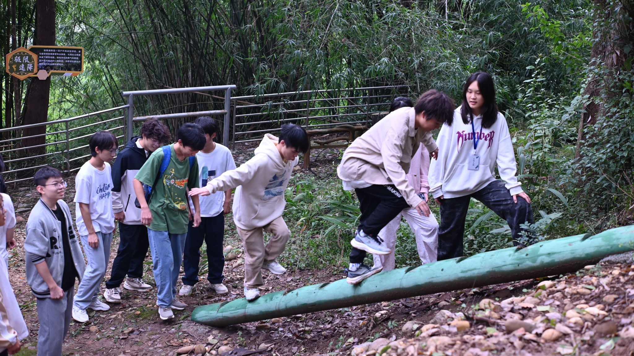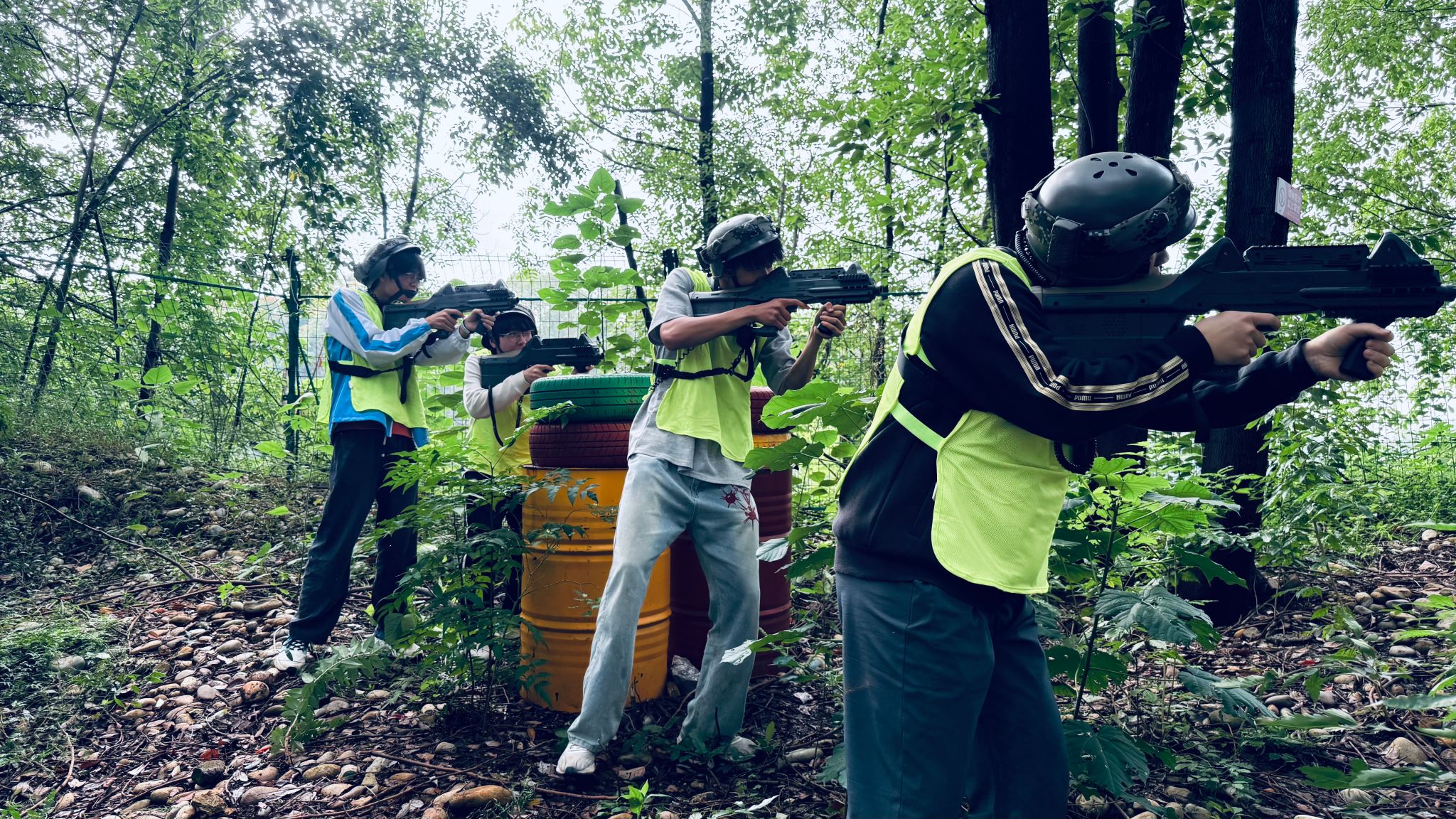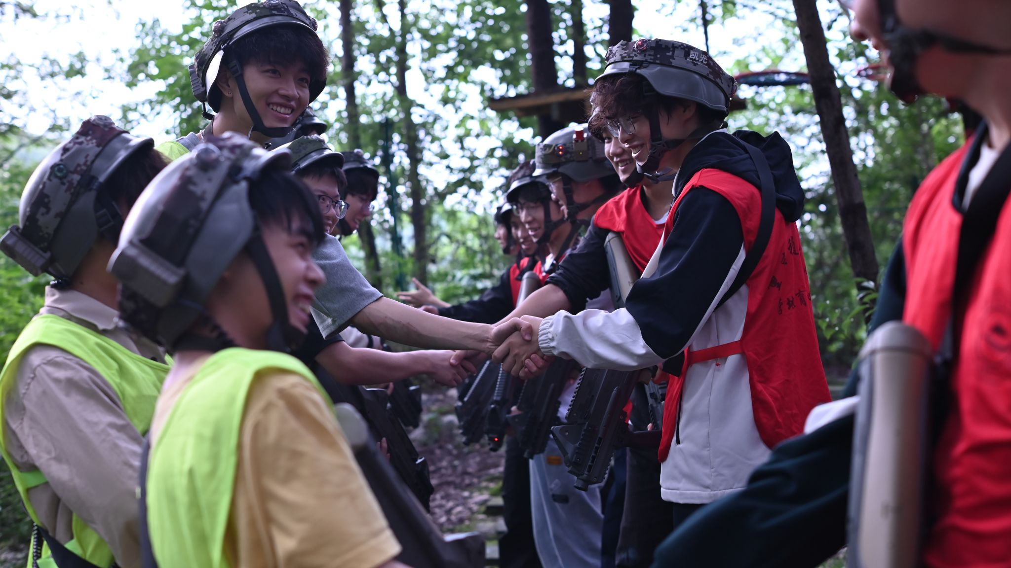 随后,活动进入“真人CS体验”环节。同学们沿着象征荣誉与拼搏的“冠军之路”,步行至花果山丛林式领导力综合营地。在模拟的丛林战场环境中,同学们分组对抗,策略谋划、团队协作、灵活应变,亲身体验了模拟军事对抗的紧张与刺激,深刻领悟到团队合作与战术执行在国防实践中的关键作用。