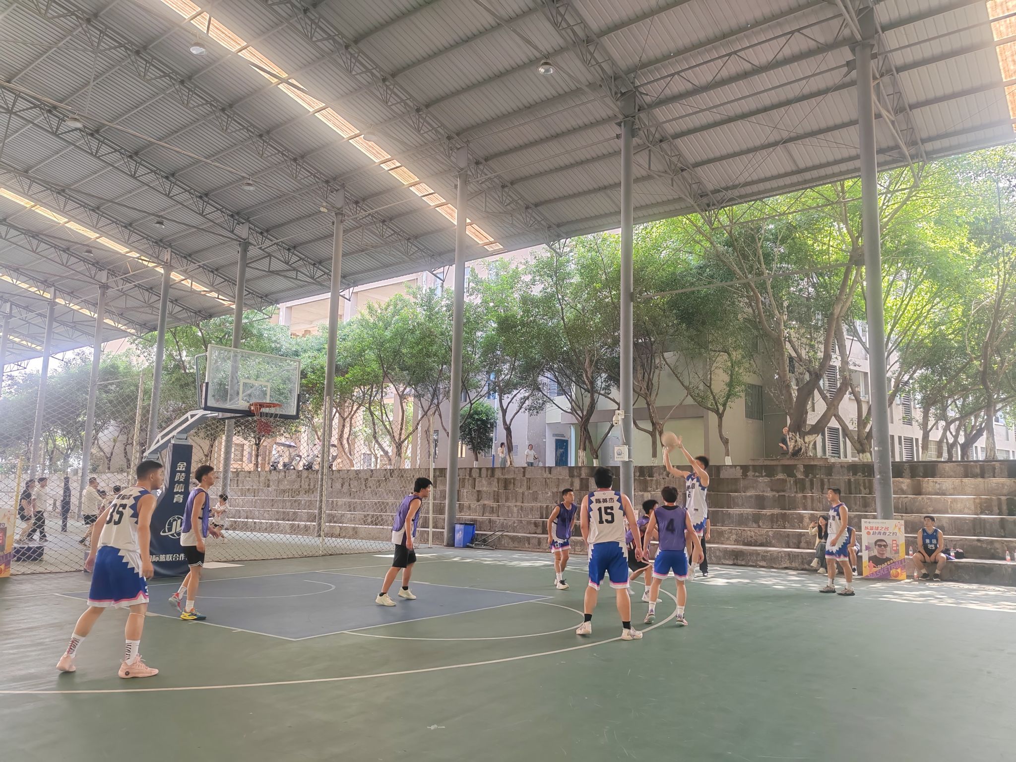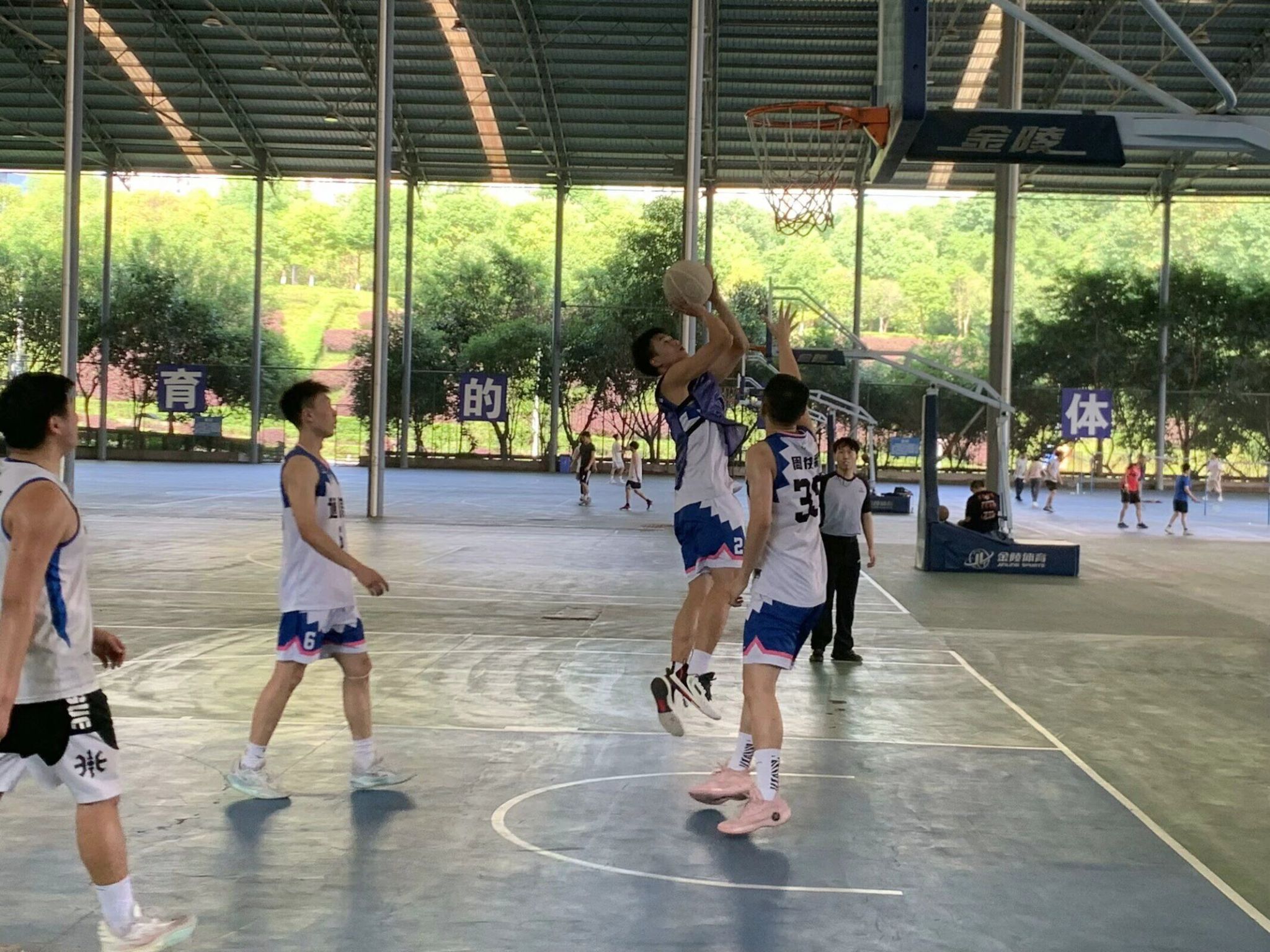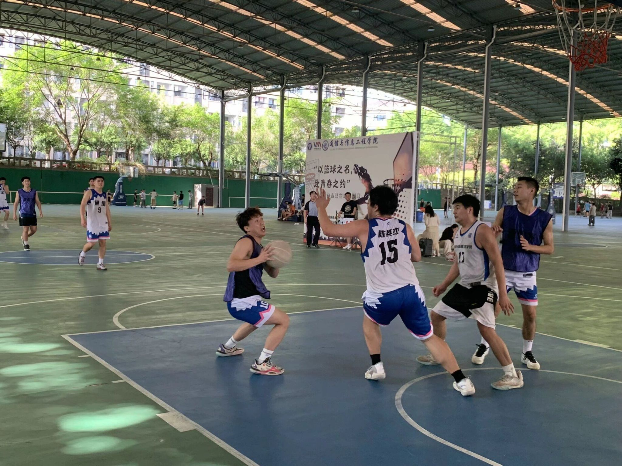 干拔跳投、挡拆后顺下空接、欧洲步上篮、突施冷箭的三分……通信篮球队队员们在球场上尽情的展示自己娴熟的球技。每一次精妙配合、传球都展现出彼此的默契,每一个漂亮的投篮、出色的防守,都彰显出他们对篮球的热爱和执着。