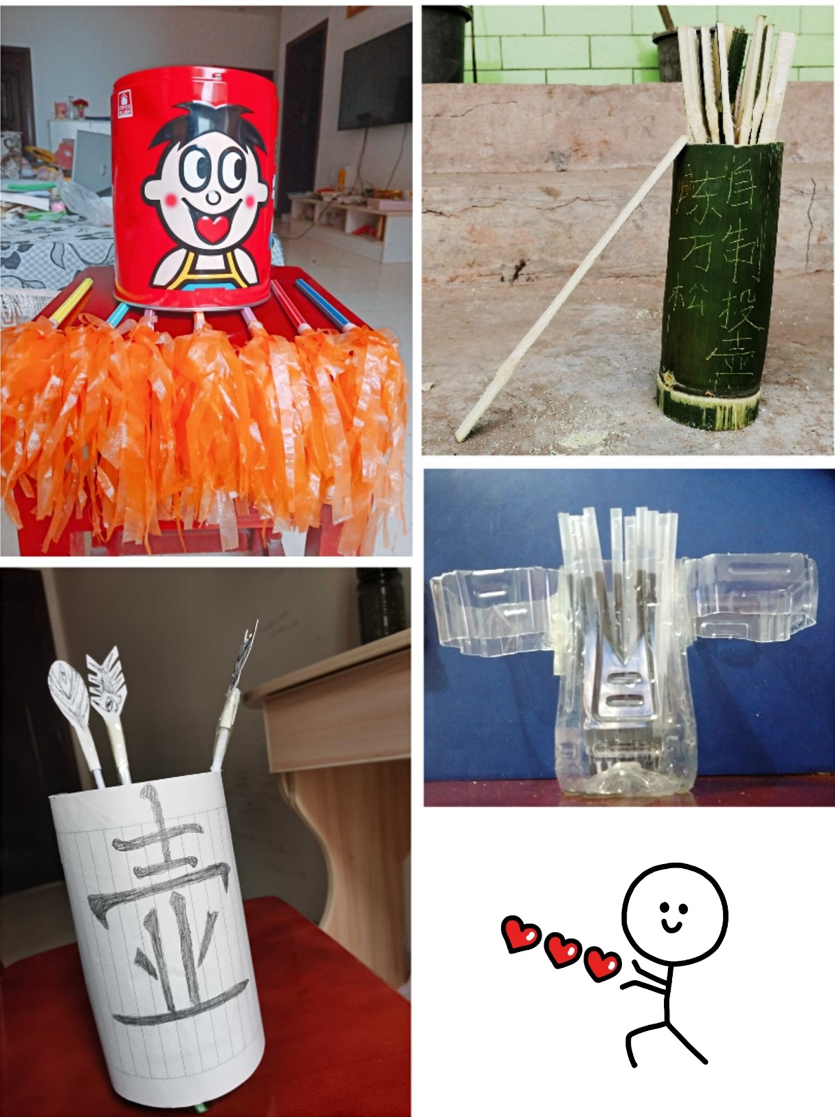 挑战自我,乐享投壶。学生通过自制或现有道具,在家中体验投壶运动,以道具准备质量和30秒内投入数量为标准,决出名次。参与同学通过动手制作箭壶、反复投掷尝试,最高以限定时间内连续投中30次夺得优胜。