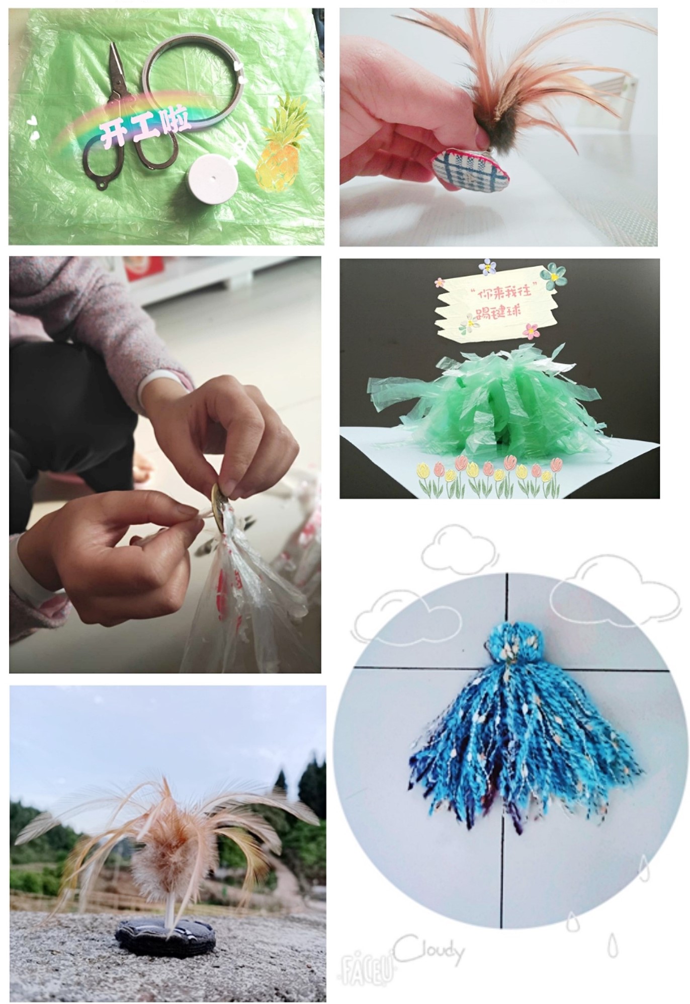 自制毽球为调动学生动手能力,增加传统体育运动趣味性,同时也丰富了学生的课余生活。同学们发挥奇思妙想,利用纸张、布条、瓶盖等材料,创作出样式各异的毽球作品,并尝试成功踢起。在了解民俗文化、制作成品、体验毽球运动的过程中,更深入体会到毽球运动的文化魅力。