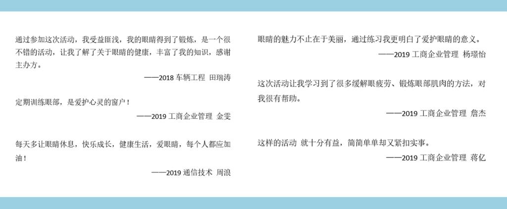 眼睛对于我们每一个人来说都是十分重要的,随着电脑、手机等电子产品的广泛运用,越来越多的人近视,再加上疫情的缘故,课程都在网上进行,看电子产品的时间也就越来越长,由此眼睛很容易疲惫。然而这次举办的护眼活动很好,在我们双眼疲惫的时候,给了我们有效的方法缓解我们眼部疲劳,使近视的我在上完网课后可以使眼睛得到放松,挺管用的!