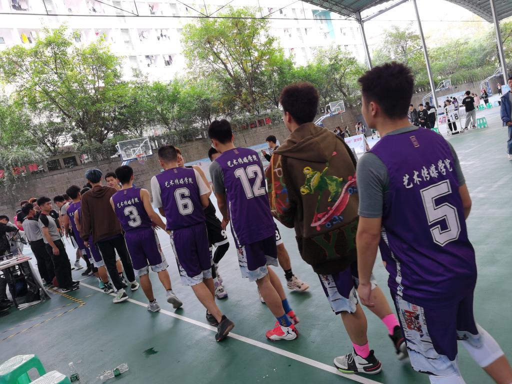 比赛还未开始,双方队员都已经在篮球场上开始热身,为后续的比赛顺利进行打下了基础,比赛将近开始,艺传队员与数信、大数据队员,分别一紫一黑,一紫一绿在比赛开始的口令声中,黑紫、黑绿相融。