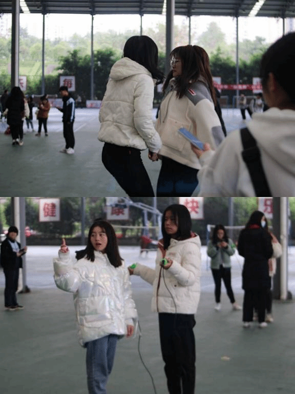 顽强拼搏显身手,跳绳舞动展英姿。比赛第二天,双人跳绳来袭,随着比赛开始,一人摇绳,两人同时跃起,搭档之间不仅要同频共振,更需要眼神的交流,节奏或快或慢,随时调整着自己最佳的节奏。双人跳绳最能展现默契合作,一个眼神,一个手势就是搭档两人独有的暗号密语,拼搏进取,意气风发,在一起一跃之间,一来一往之中,跳出青春,更跳出风采,喝彩加油声亦不绝于耳,点燃全场激情。