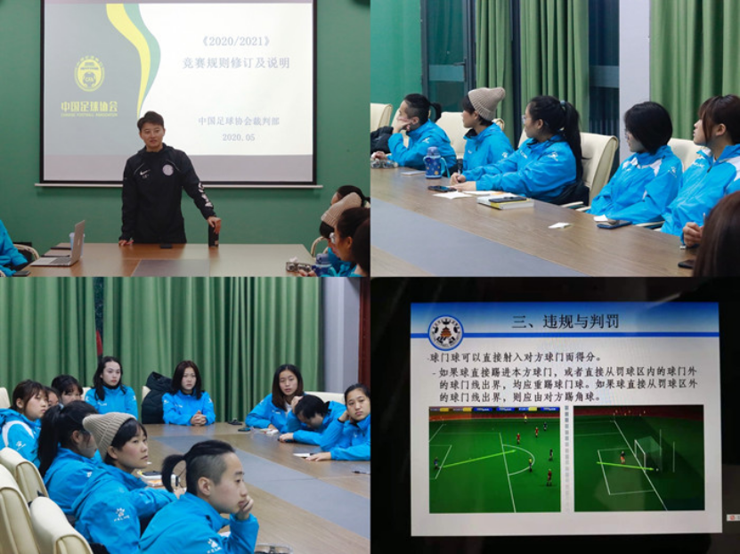 本月,移通女足在罗诗艺教练的带领下进行了一堂关于足球竞赛规则的培训课。虽然女足队员们在足球场上的足球技术比较娴熟,但对于足球竞赛的规则还是有些许欠缺。而本次培训正是针对这个问题,解决在比赛中关于竞赛规则的疑问。培训主要教了裁判员在竞赛中对于不同手势示意的含义。例如间接任意球右臂上举、直接任意球右臂平举指向犯规方、界外球手臂平举指向最后一次触球方、以及最新规则中越位球的定义、角球手臂斜向指向角球点等规则。会踢球更应当能懂规则,只有队员们了解了足球竞赛的规则,才能在场上更好的阅读比赛,在最快时间对裁判的示意做出反应,调整技战术。通过这次培训课受益匪浅,了解了规则的重要性,今后会更加重视这方面的学习,让每一位队员对足球比赛有更全面的了解。