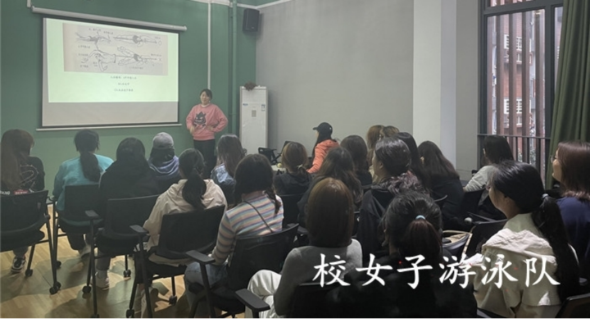 校女子游泳队于10月14日在爱莲书院开展理论知识学习。主要学习并掌握自由泳呼吸及手腿配合理论知识,通过PPT的讲解和视频播放让新队员对自由泳技术动作形成脑部图像,以便更快更好的完成训练任务。
