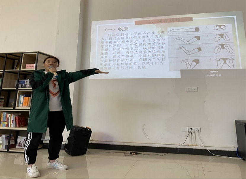 10月20日,教练王钰涵与外国语学院开展本学年第一期游泳兴趣圈,以学习蛙泳理论知识为主,通过PPT的讲解使学生对游泳项目和蛙泳技术动作有了初步的了解,对后期下水实操奠定了坚实的基础。