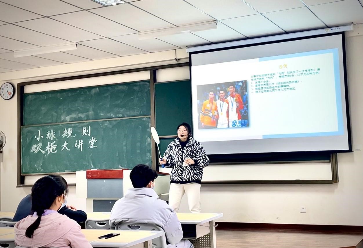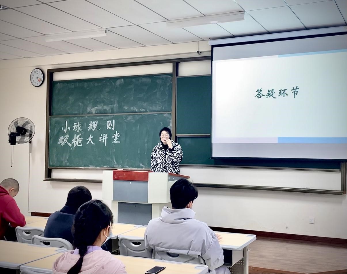 复盘回顾,答疑解惑。在提问环节中严鑫同学提出自己疑问:羽毛球双打为什么要前后站位。老师解答到:前后站位能够更好的发球,并且每个人的分工更容易理解,能够更好的反手抽球、解围、补位。相比平行站位,业余比赛中接球率会更高。刘洋同学问到:乒乓球比赛过程中发球触网该如何判罚。吴生亮老师回答到:现行国际乒联触网规则,如果发球擦网后落在对方球台上要判重发球。如打球时擦网则比赛继续,如果擦网后出界或弹回自己这边球台,对方得分。提问环节同学们积极互动,是对老师授课的肯定也是同学们积极思考的表现,在互动氛围中收获知识,正是本次“双栀大讲堂”的目的。