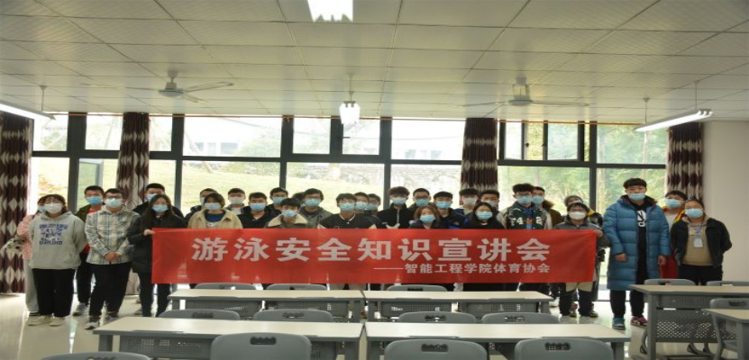2021年11月17日,校男子游泳队在竹逸A101开展。主要由校男游队面向智能工程学院全体学生进行游泳安全知识的介绍及讲解,内容包括游泳前的热身准备、注意饮食、自救等方面。目的是使大家对游泳安全有一个清晰的了解。