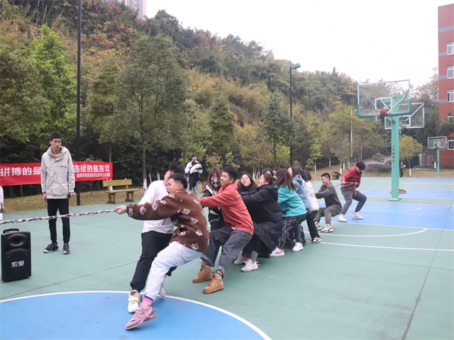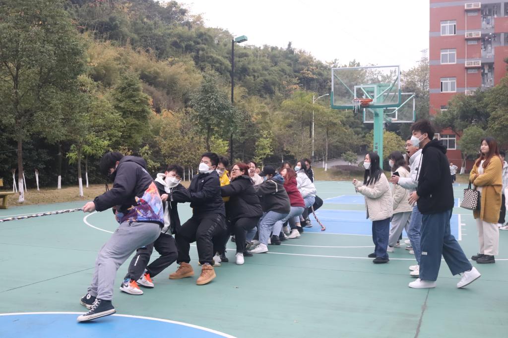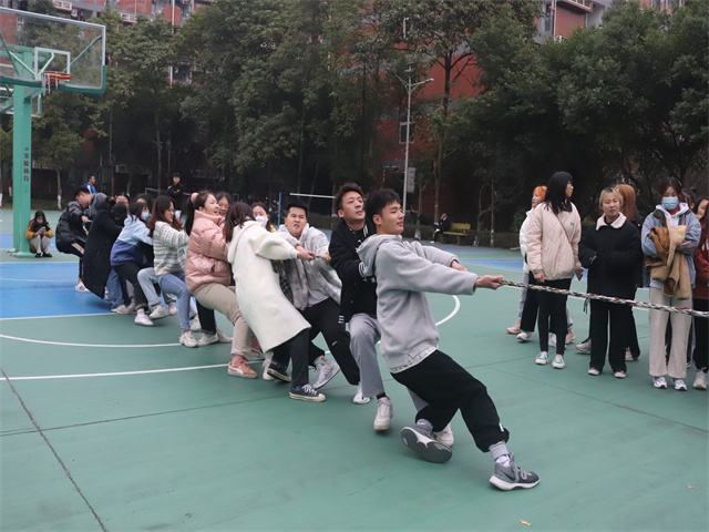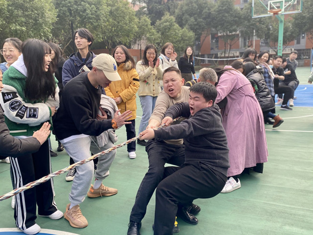 高昂的斗志,默契的配合,不屈的精神是拔河比赛的根本奥义。2021年12月8日下午,在鱼城书院外篮球场,各年级学生代表队有序进场,各队长齐聚场前抽签,带领各自队伍,分别位列拔河绳两旁,凝神聚气,屏住呼吸,在裁判示意下,从地上拉起长绳,暗暗发力跃跃欲试。“一二、一二”加油声令人振奋,随着一声哨响,裁判举手示意,欢呼声不绝于耳。哪怕失重倒地,哪怕肌肉酸疼,哪怕手掌擦伤,却依然难掩笑容,那脸上的欢愉与激动是那么令人动容。