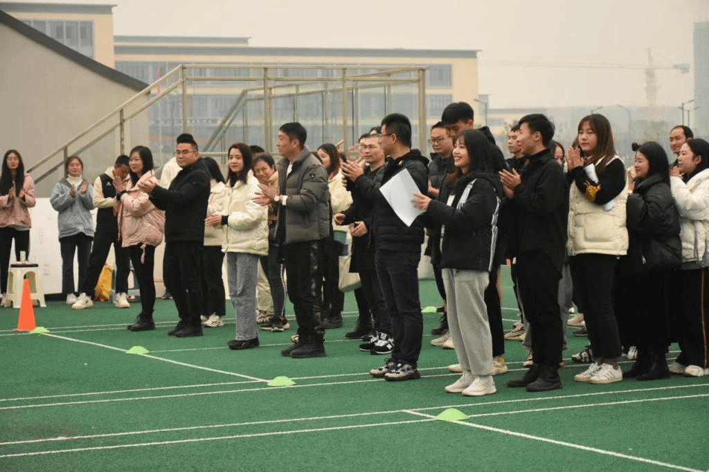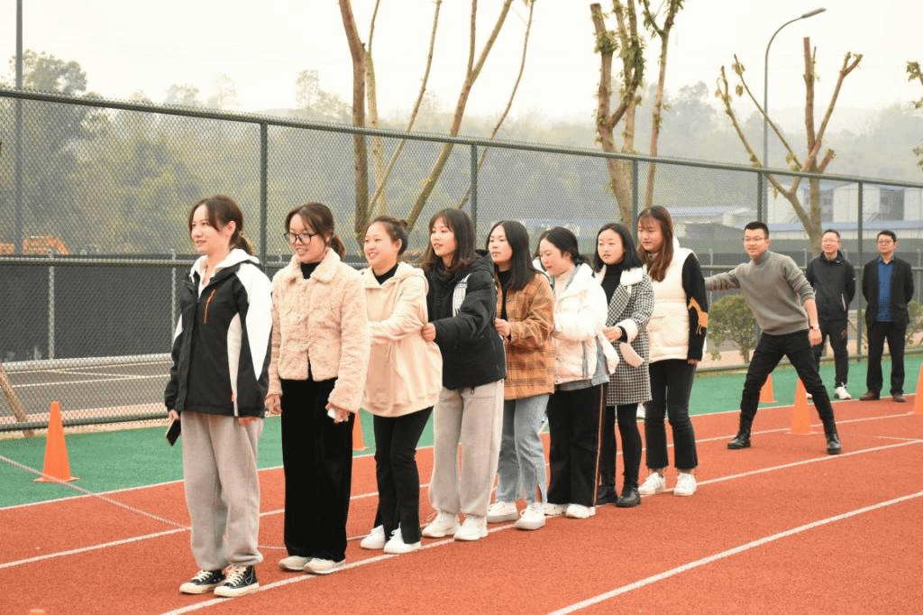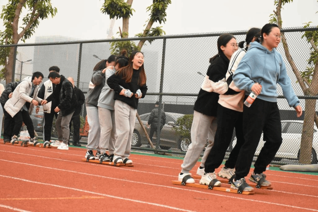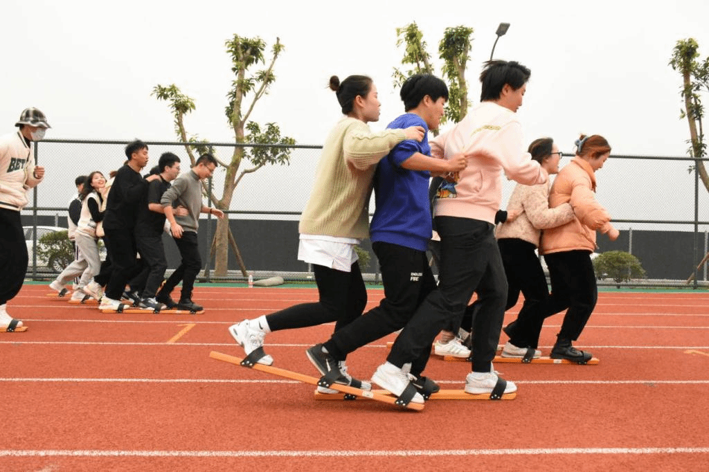 老师们三人一组穿好木板上的鞋子,双手搭在队友的肩上,喊出口号“左右左,左右左”,比赛一开始便奋勇前进,整齐的口号和划一的动作,老师们就好像是一个个忙碌的小火车,朝着自己的目的地前进。