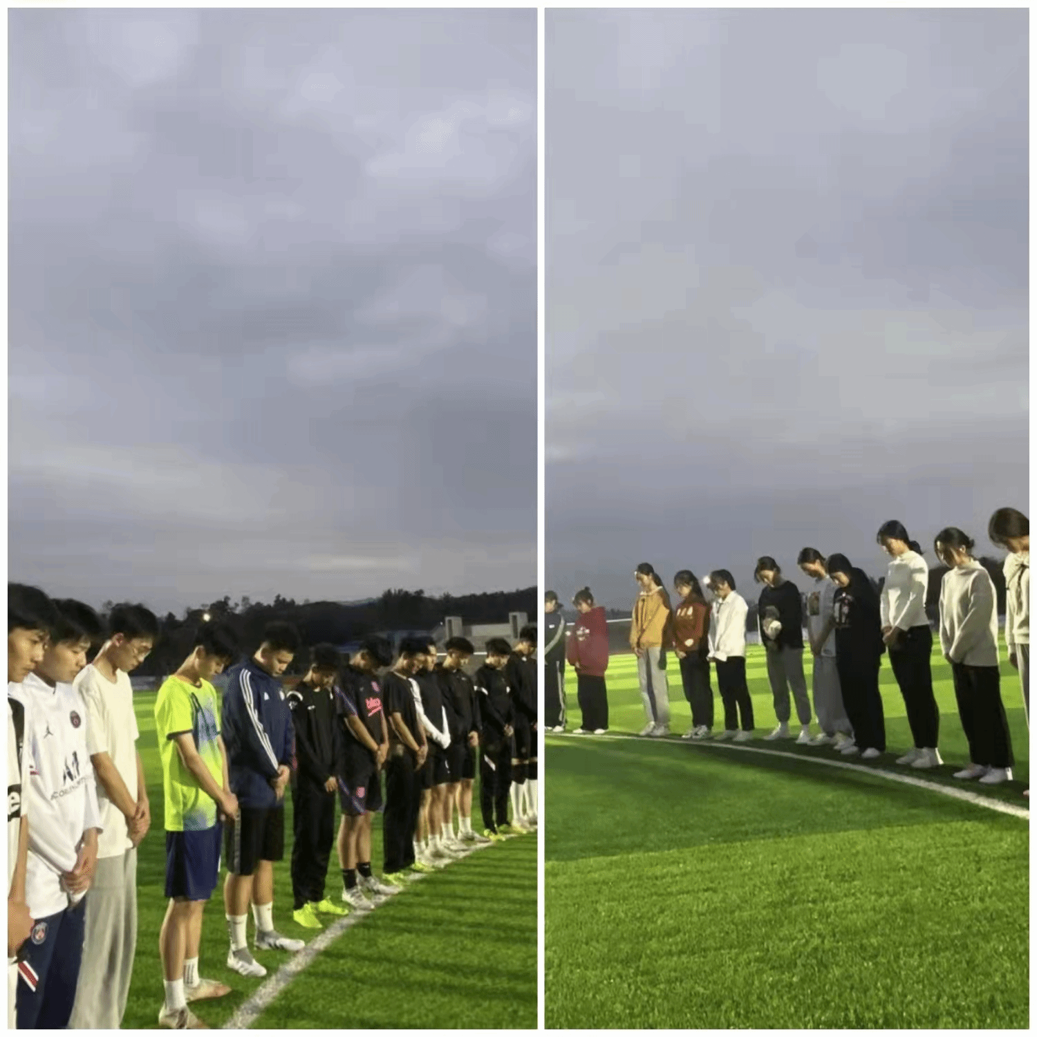 伴着綦江的冬日暖意,预示着中华民族的红红火火,繁荣富强。重庆移通学院綦江校区的男子足球队和女子足球队在曹静教练和龚思文教练的带领下,一群充满活力与朝气的新青年们站在足球场中圈,,低头为逝者默哀。