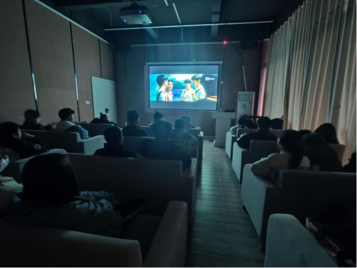 在观影室中,同学们认真观看《五个扑水的少年》电影并沉浸于故事情节中。该片讲述了五名性格迥异的高中男生阴差阳错加入了学校的男子花样游泳队,为了心中重燃的热血,少年们决定一起迎接这场“男子花样游泳”青春反击战的故事。正如电影中演绎那般,生活与学习中我们会面临重重困难,但五个性格迥异的少年却直面困境,认真努力地练习水上芭蕾。在这个过程中他们也曾濒临崩溃,想过放弃,甚至想过解散花游队。但是,故事的最后他们依然坚持下来了,并用精彩的演出证明了自己,证明了在生活中我们大部分人都是普通人,但每个普通人都是独一无二的,依然可以做成不普通的事。青春是饱含热情的,是一腔孤勇且无所畏惧的,只要你想做,坚持并努力去行动,最后终会收获意想不到的结果。
