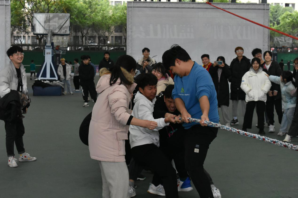 热身环节,吴生亮老师带领同学们跳起了热身操,伴随着激情与活力的音乐,同学们跟随着老师一起律动,感受冬日运动的魅力。由于此次拔河采用全新的拔河模式——三向拔河,所以在比赛开始前,吴生亮老师为同学们介绍了三向拔河规则。三向拔河开始,数字经济5班的同学气势如虹,团结一心,用整齐的“1、2”喊出他们的节奏,最终打破三足鼎立的局面,获得首轮比赛的胜利。