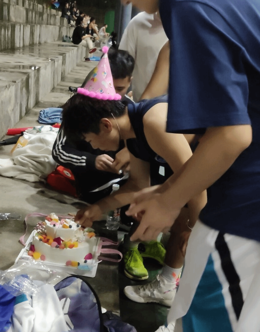 比赛结束后,为了向大四学长们表达自己诚挚的毕业祝福,学院男篮院队队员们为毕业学长准备了祝福蛋糕。男篮队员们在划蛋糕的时候小心且珍惜,他们不舍哥哥们的离去,但心里也祝愿他们能有锦绣前程。虽然比赛结束了,蛋糕吃完了,但浓浓的情意依旧长存。