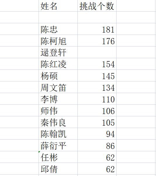 最后,一位名叫陈忠的同学以181的成绩排列于单人跳绳榜单的第4名,距离第三名仅仅差9个,虽然没有同学成功挑战前三,但也赢得了我们的欢呼与掌声。