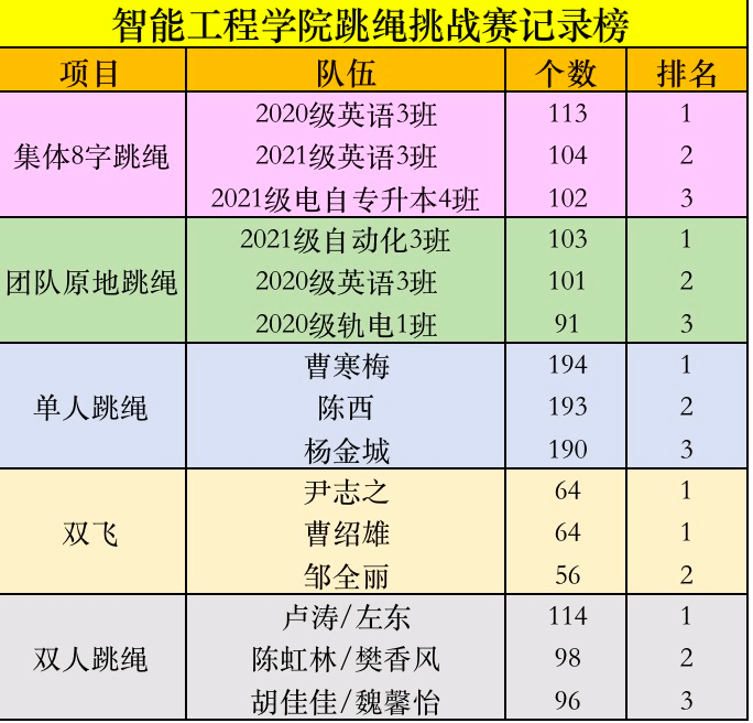智能工程学院分别在今年的3月、4月、5月举行了三次“跃动七点半”跳绳挑战赛,涉及到电气类、机械类、车辆工程等专业,同学们在体力极限的情况下,咬牙全力提高挑战成绩,展现出了智能工程学院学子奋勇拼搏的精神。在第二次跳绳挑战赛中,电气工程及其自动化专升本4班在双飞、双人跳绳、集体8字跳绳中打破了以往的记录。成功的挑战,进一步激发了同学们对于跳绳运动的热情。