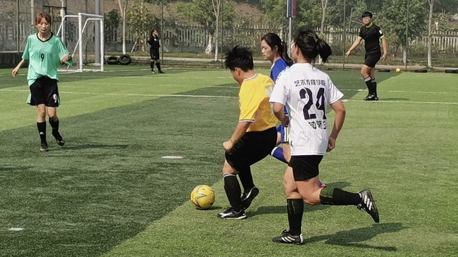 2022年10月18日中午,2022-2023学年“新生杯”足球赛艺术传媒学院与数字经济与信息管理学院女足比赛在D区足球场顺利展开。