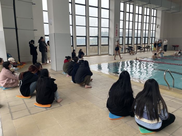 来到游泳馆,大家参观室内恒温泳池的训练环境并观看队员们的训练,了解校队对处于不同阶段队员的特别培养方案,旨在帮助初学者培养兴趣,帮助熟练度高的队员精进泳技。队长针对同学们关于训练时常、考勤标准等问题进行解答。活动结束后,同学们在游泳馆前进行合影留念。