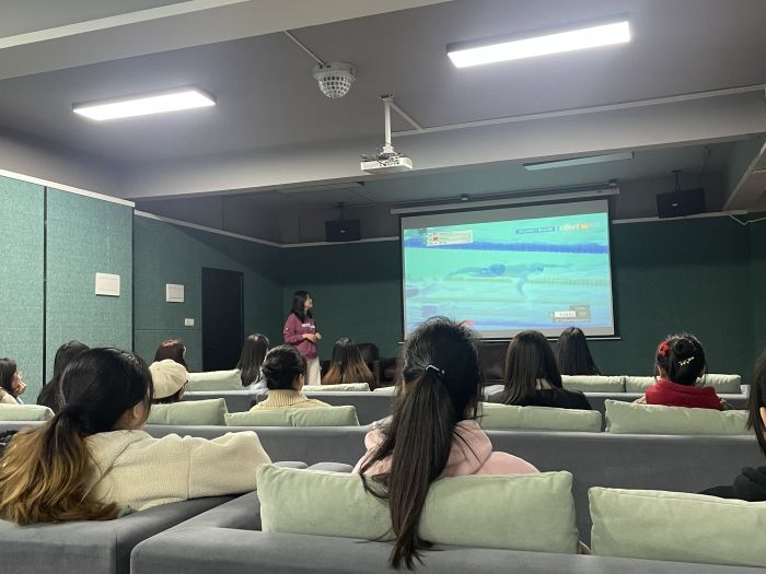 活动开始,王钰涵教练先为大家播放了一段我国运动员汪顺在比赛中的混合泳视频,并结合视频内容介绍了蛙泳、自由泳、蝶泳、仰泳四大泳姿,以帮助不熟悉泳姿的同学们对游泳进行初步的了解。接下来,教练以近期火爆的院线电影《热辣滚烫》为引入,带大家走进游泳,走进校㵘淼女子游泳队。通过王钰涵教练的讲解,同学们了解到校女子游泳队的团队荣誉和建队精神,也认识到在队内的日常生活不只有水下训练,还有特色团建活动以及游泳理论学习。优秀队员的丰富履历和学姐队长们的寄语让新同学们倍感鼓舞,感受到学校对竞技体育的重视和鼓励。